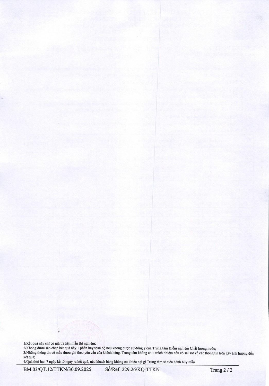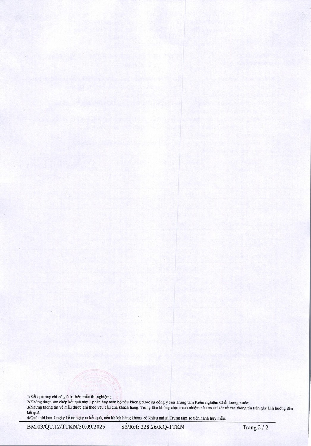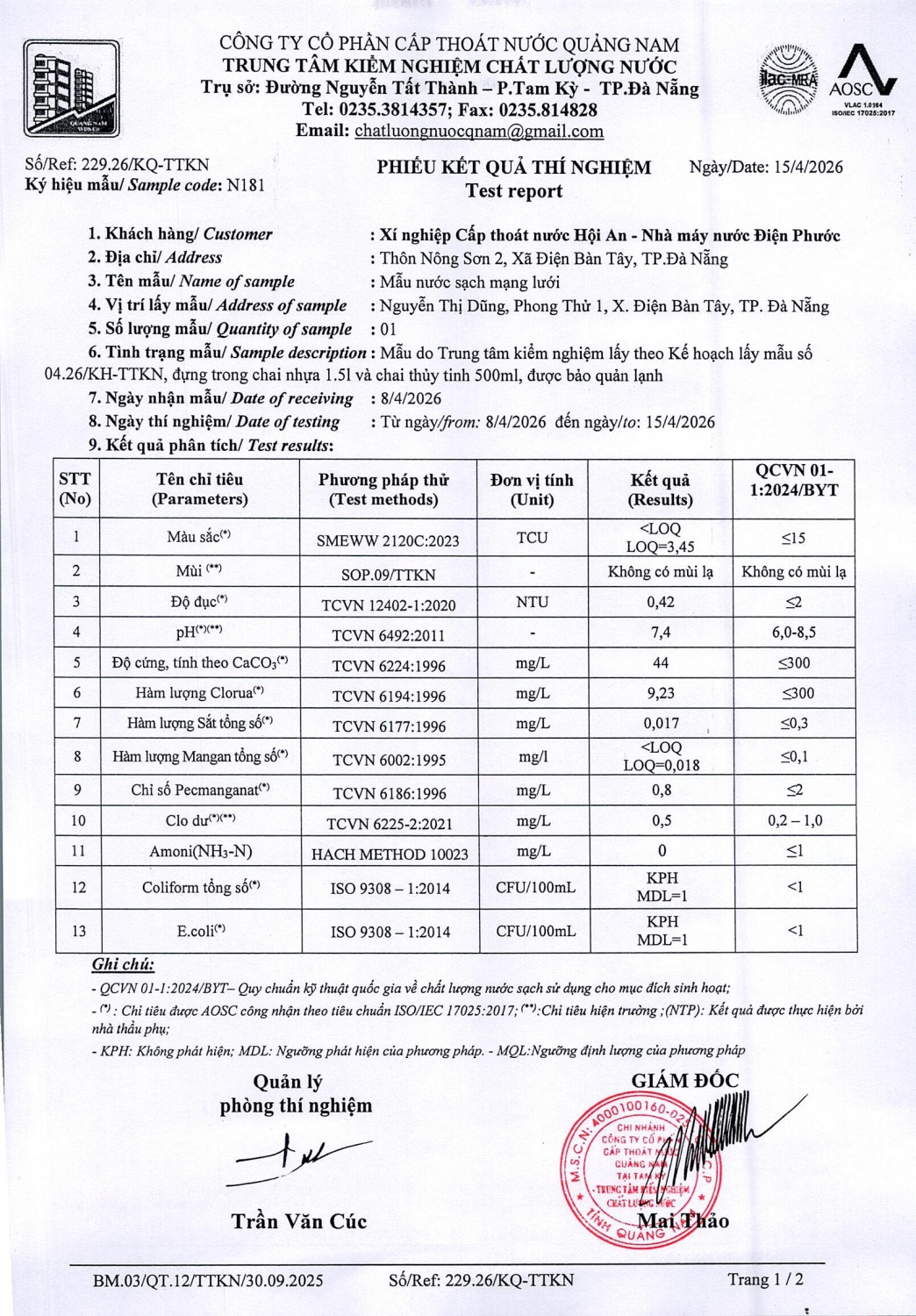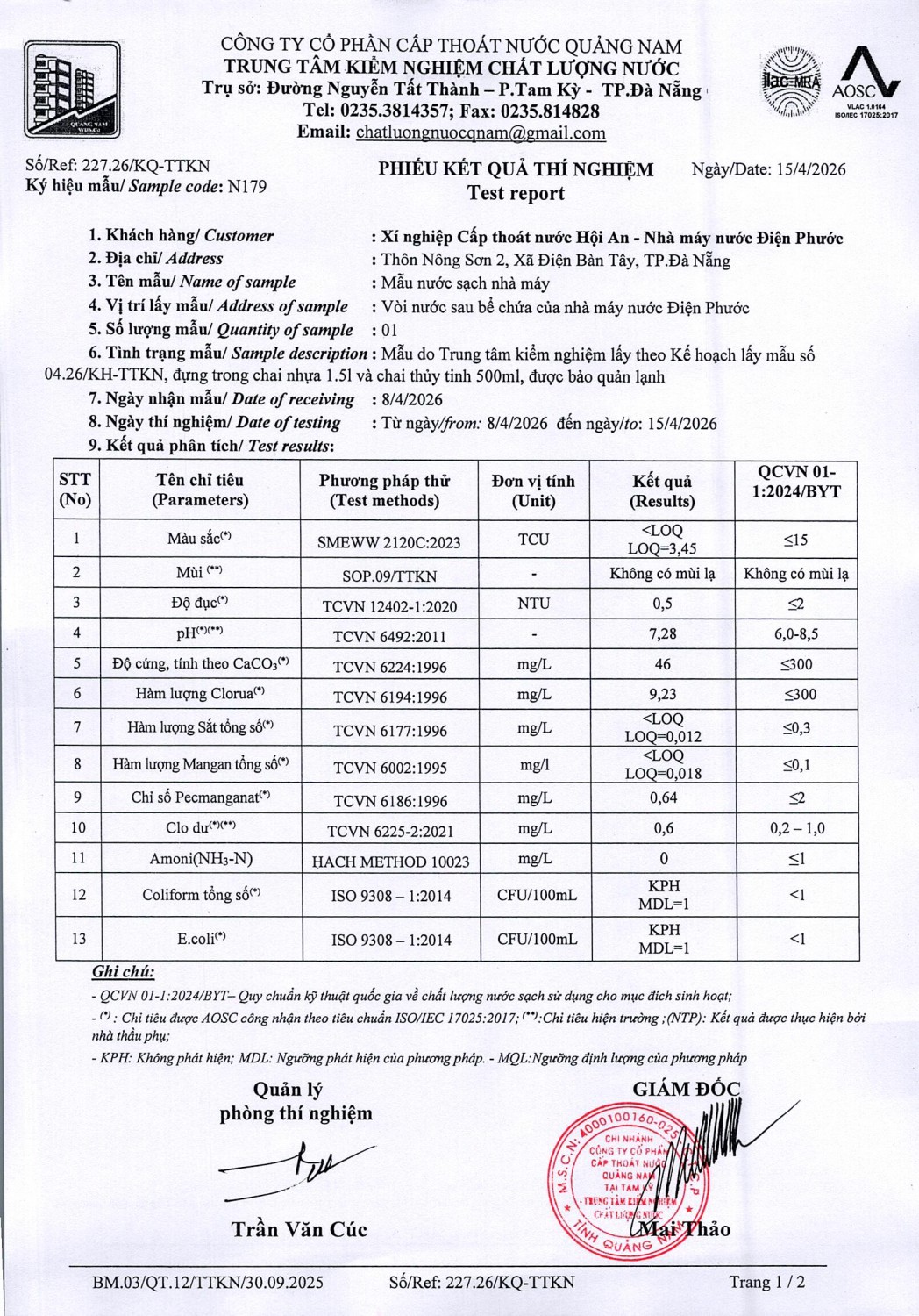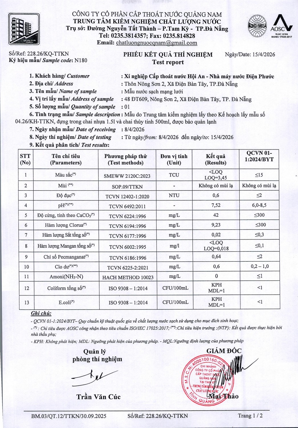 KẾT QUẢ CHẤT LƯỢNG NƯỚC XÍ NGHIỆP CTN HỘI AN - NMN ĐIỆN PHƯỚC THÁNG 4 NĂM 2026