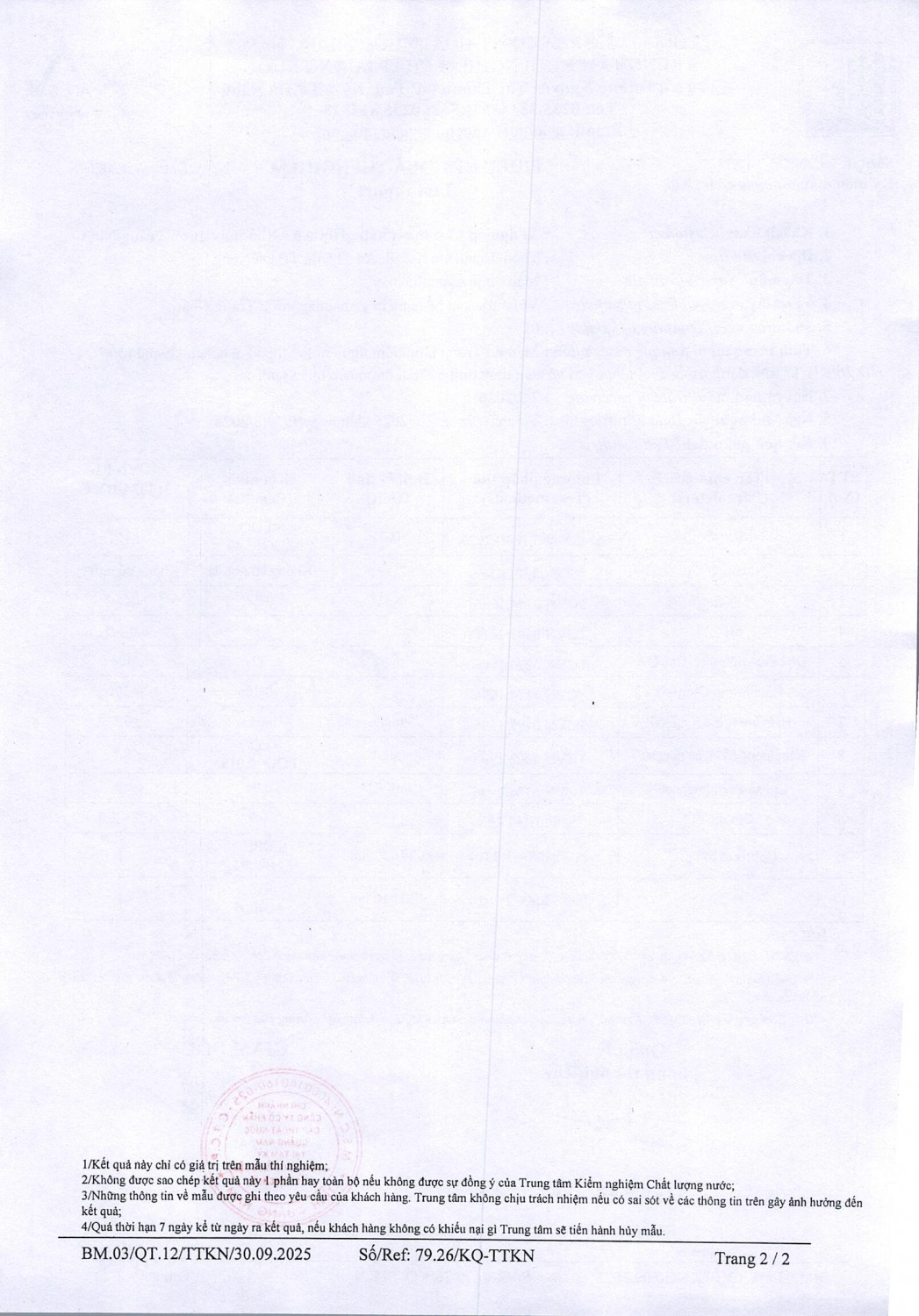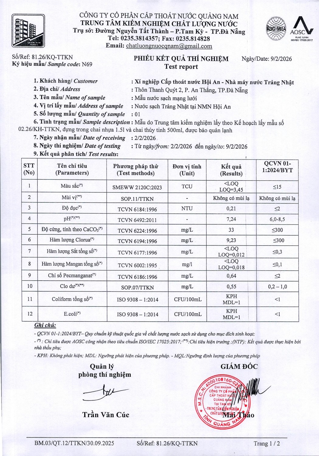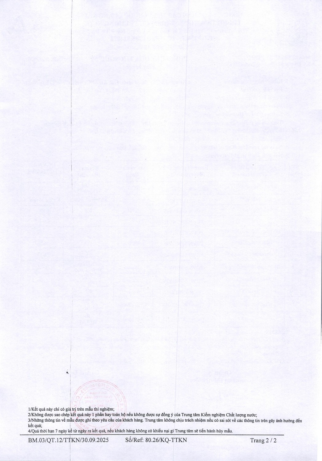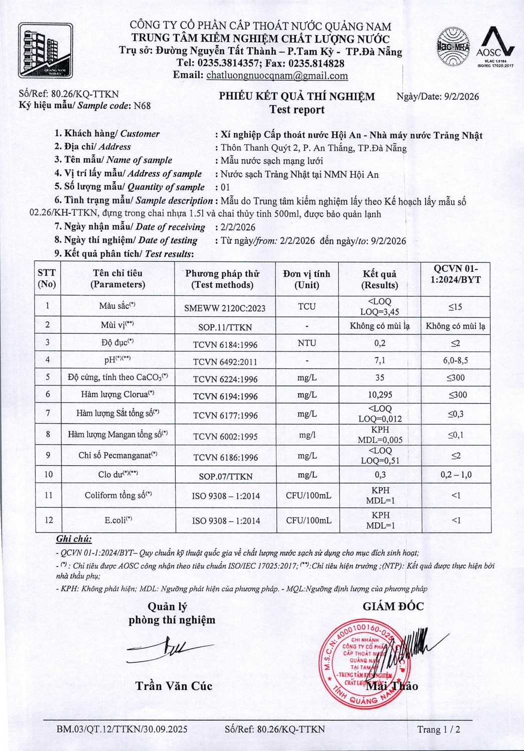 KẾT QUẢ CHẤT LƯỢNG NƯỚC XÍ NGHIỆP CTN HỘI AN - NMN TRẢNG NHẬT THÁNG 2 NĂM 2026