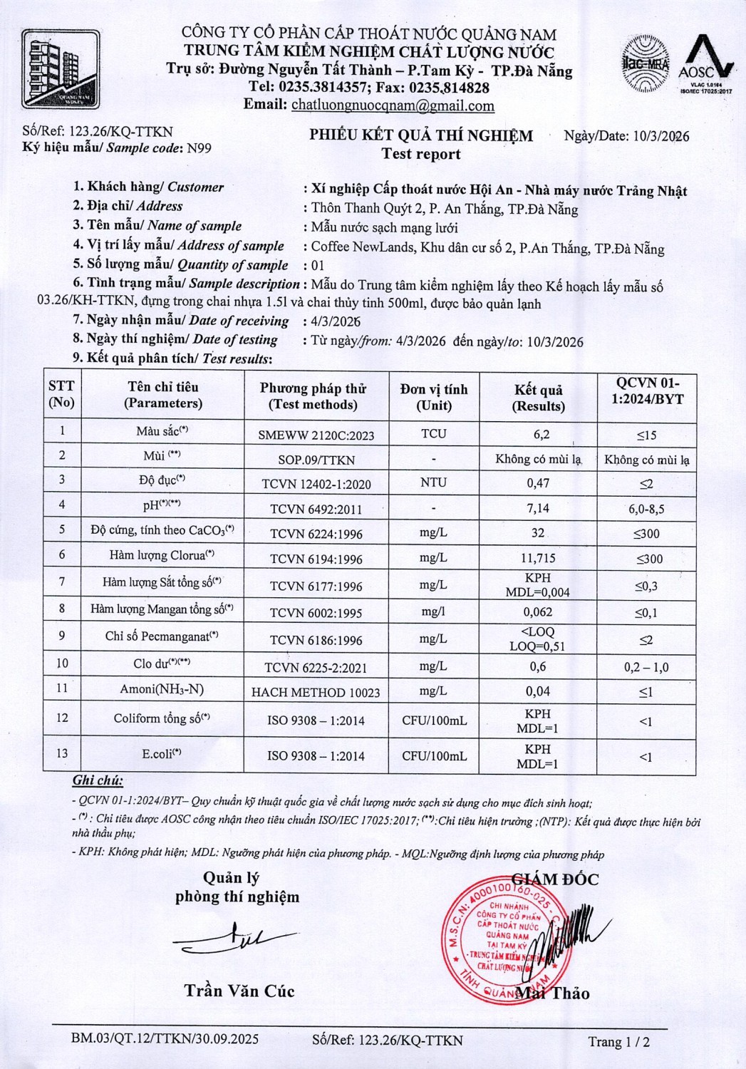 KẾT QUẢ CHẤT LƯỢNG NƯỚC XÍ NGHIỆP CTN HỘI AN - NMN TRẢNG NHẬT ĐỢT 1 THÁNG 3 NĂM 2026