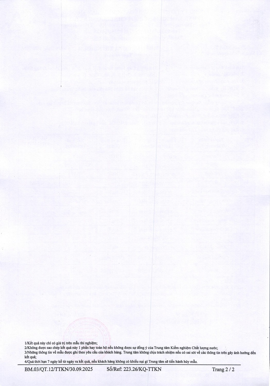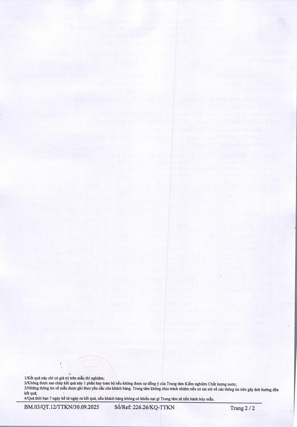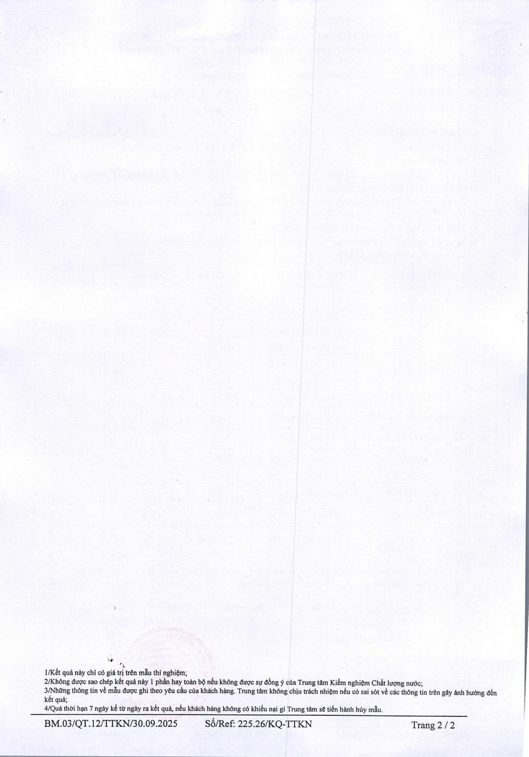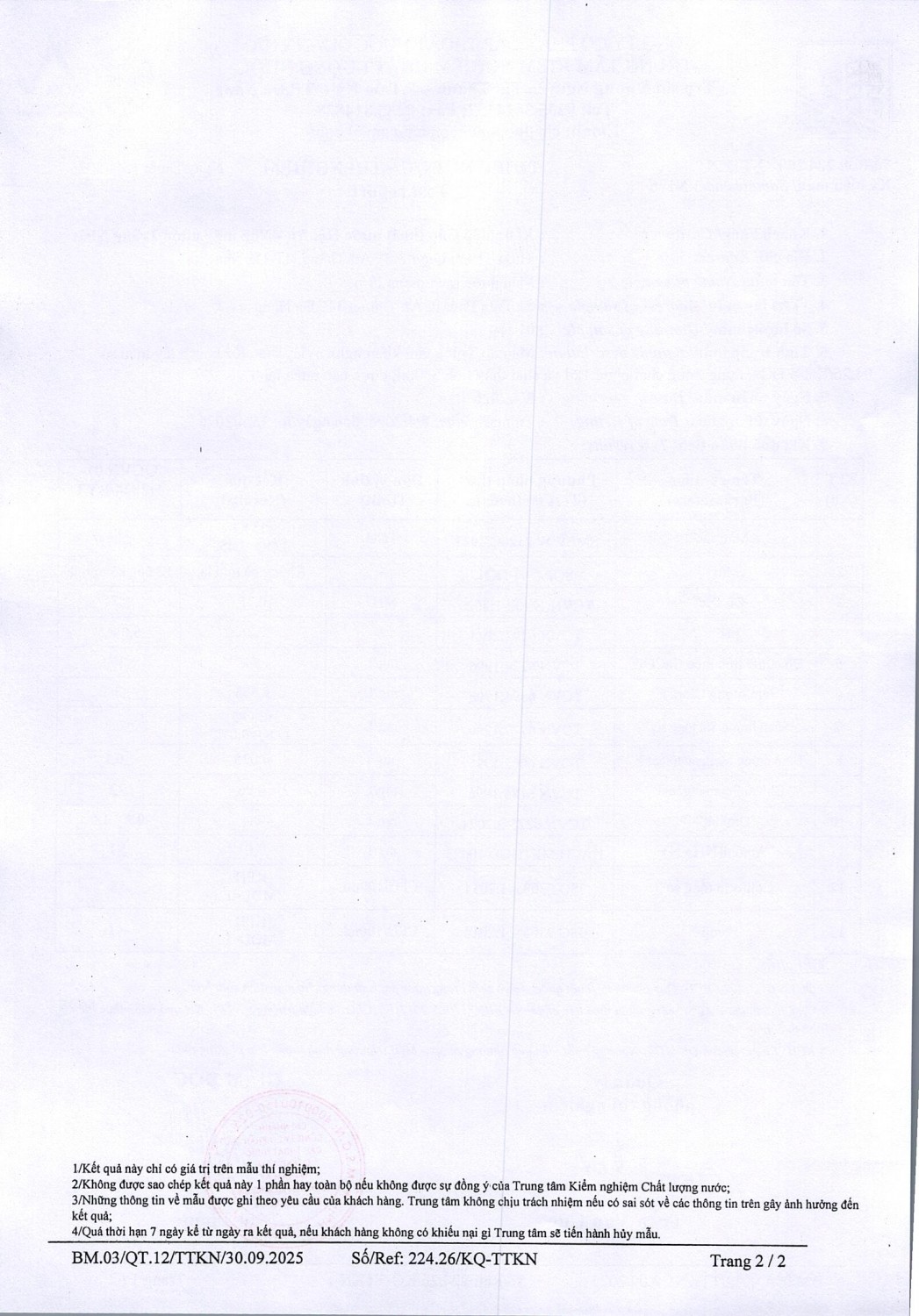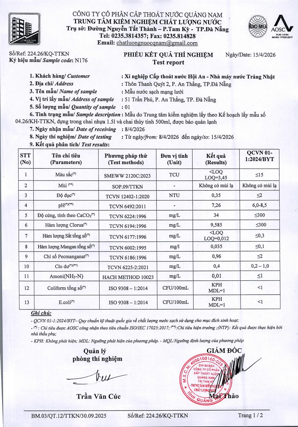 KẾT QUẢ CHẤT LƯỢNG NƯỚC XÍ NGHIỆP CTN HỘI AN - NMN TRẢNG NHẬT THÁNG 4 NĂM 2026