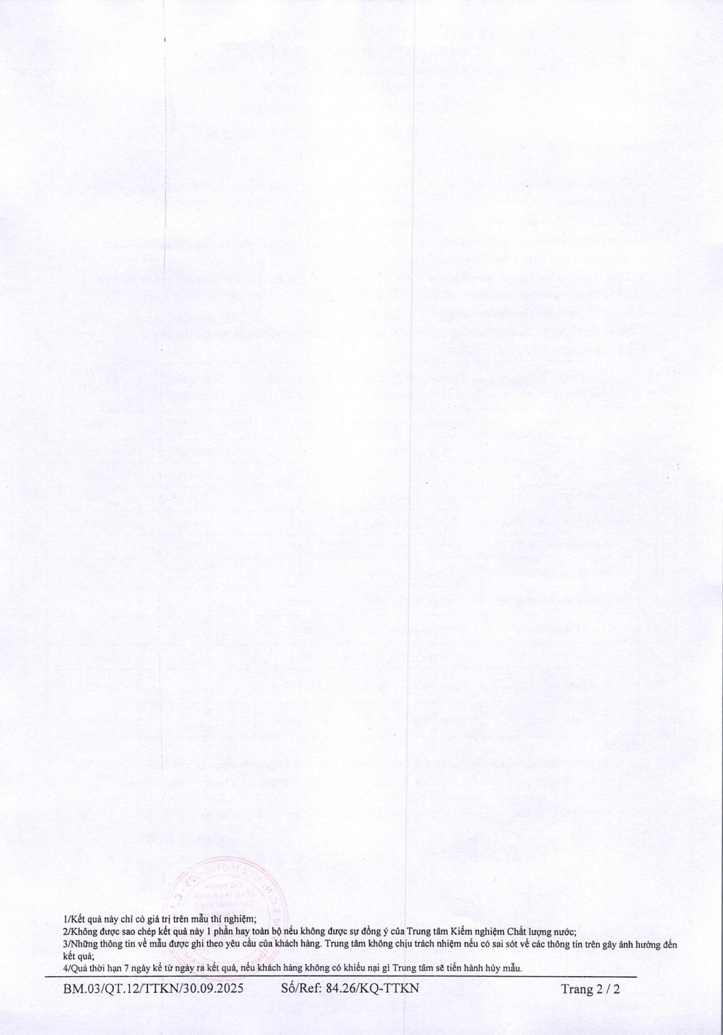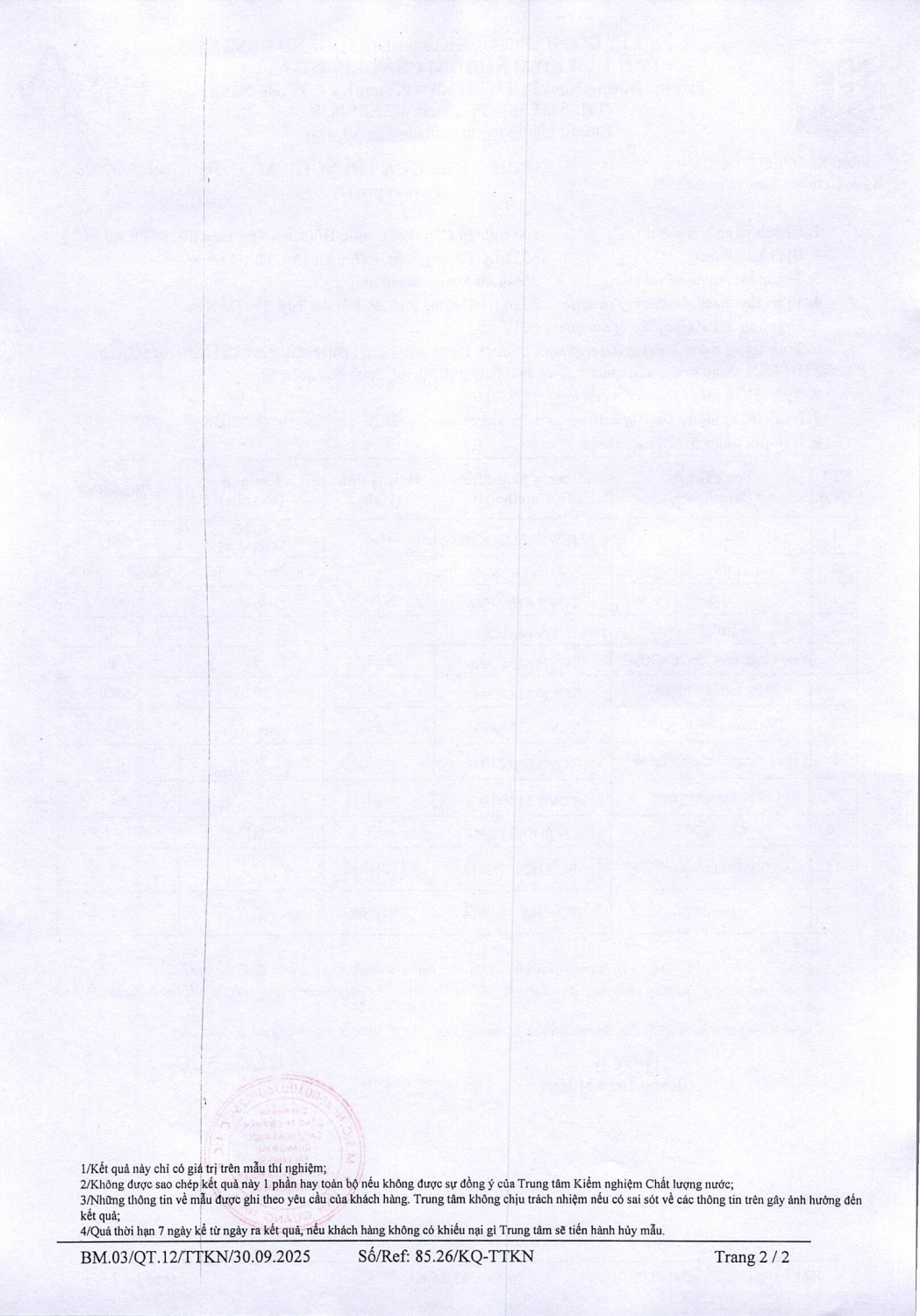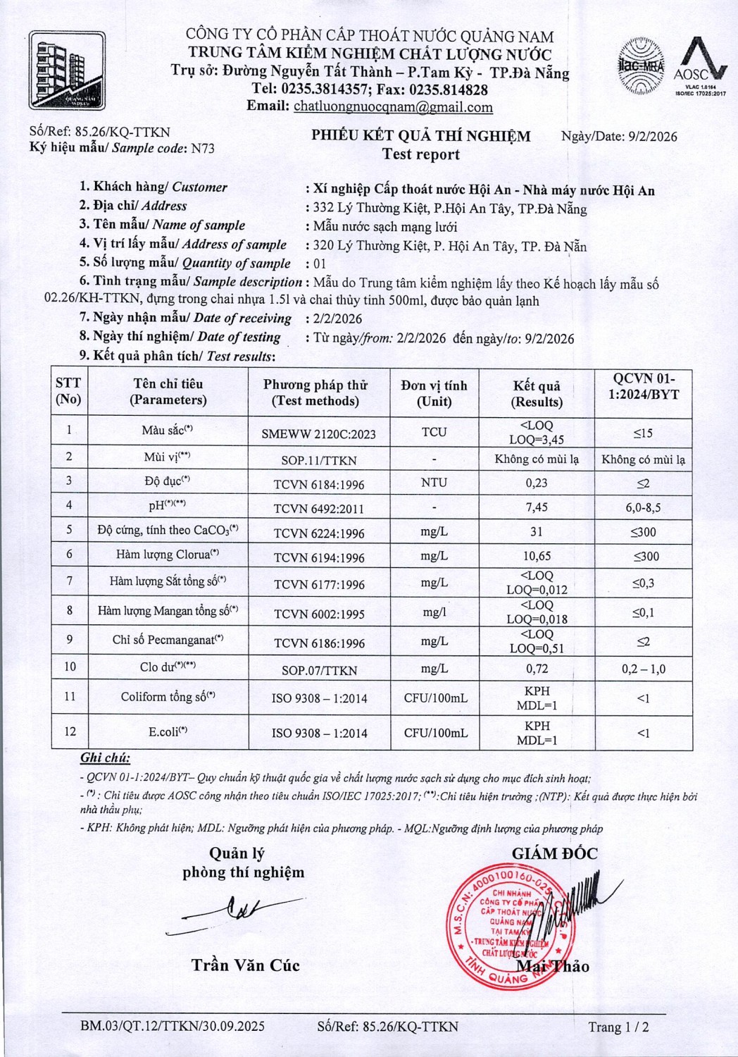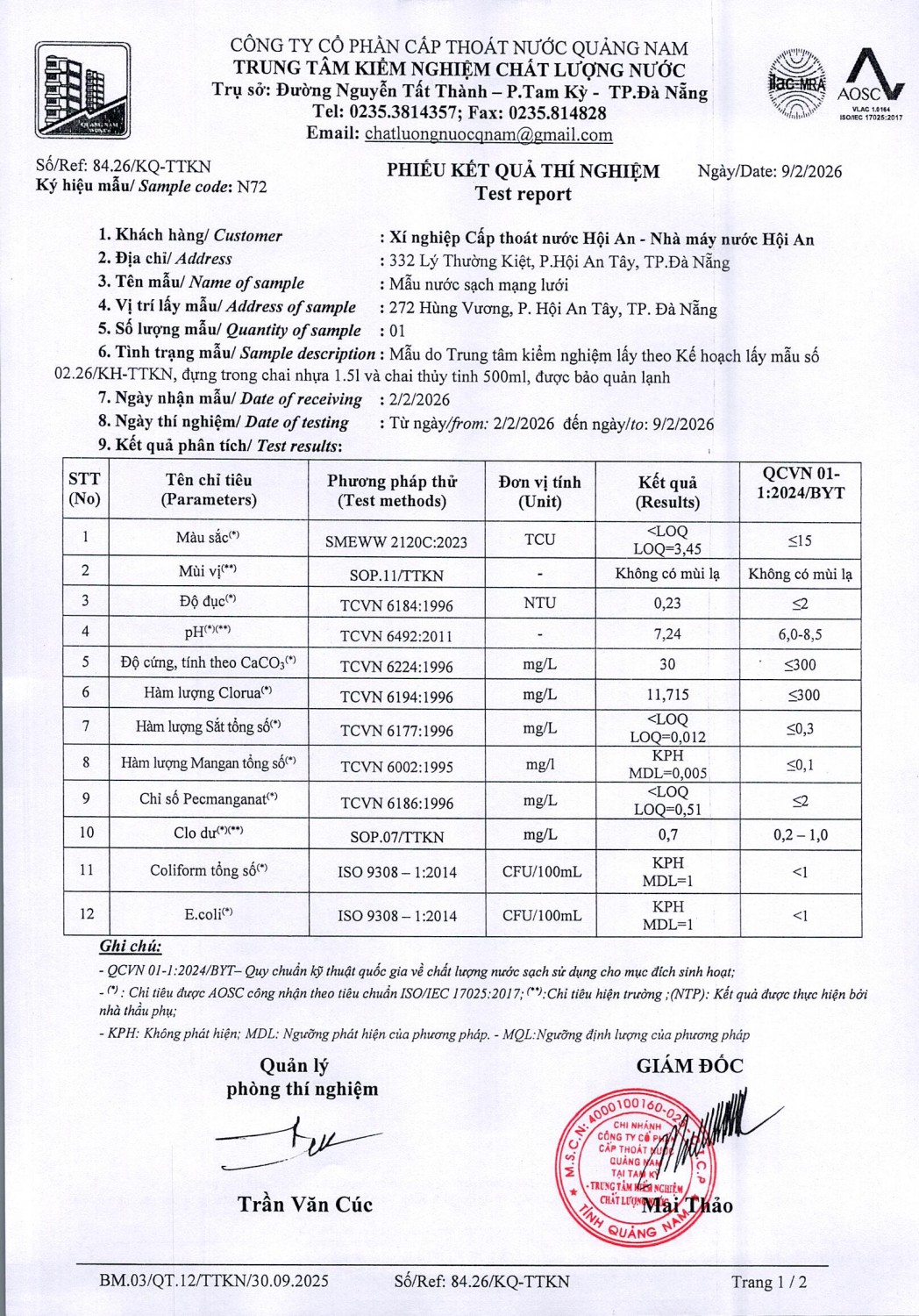KẾT QUẢ CHẤT LƯỢNG NƯỚC XÍ NGHIỆP CTN HỘI AN - NMN HỘI AN THÁNG 2 NĂM 2026