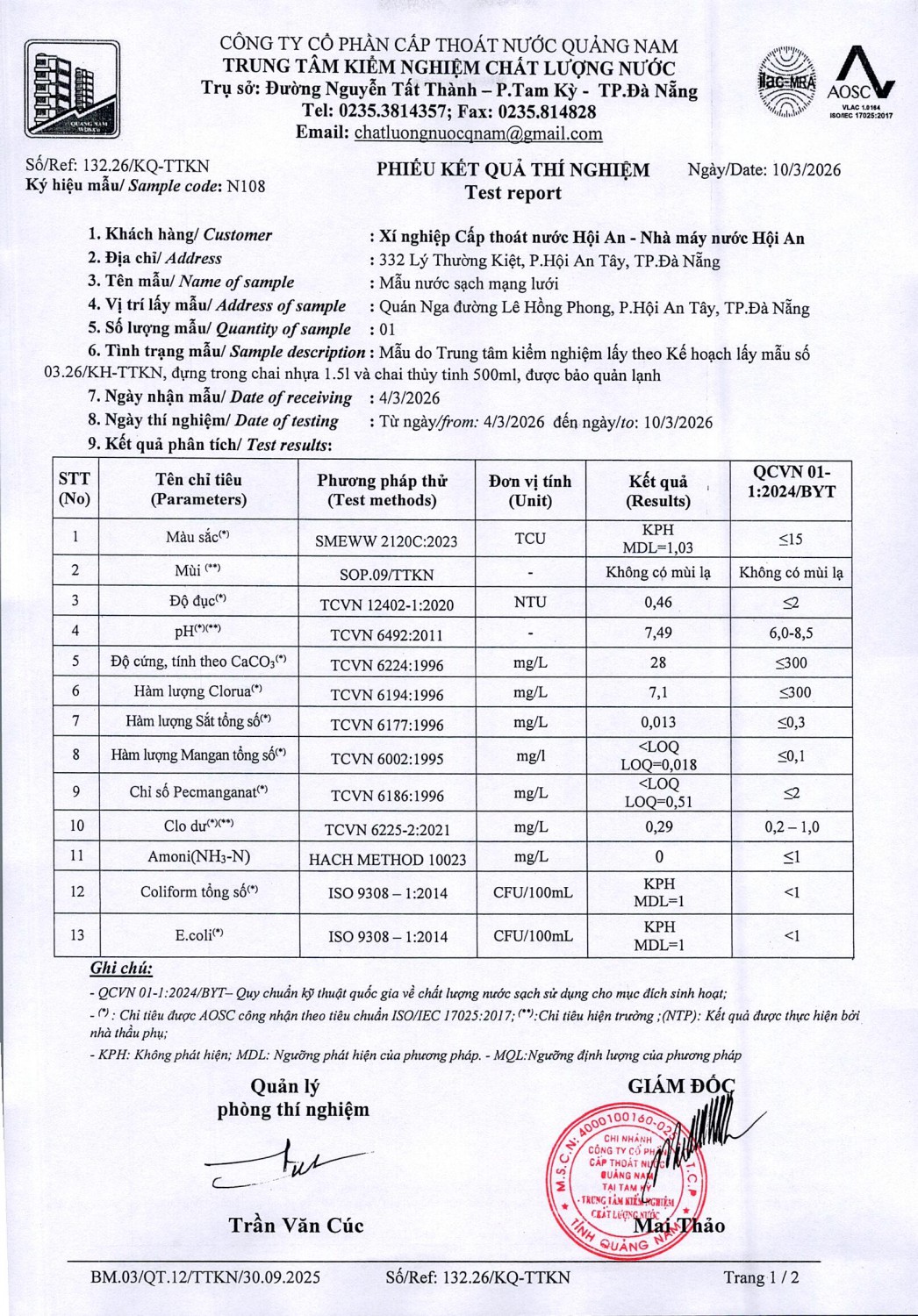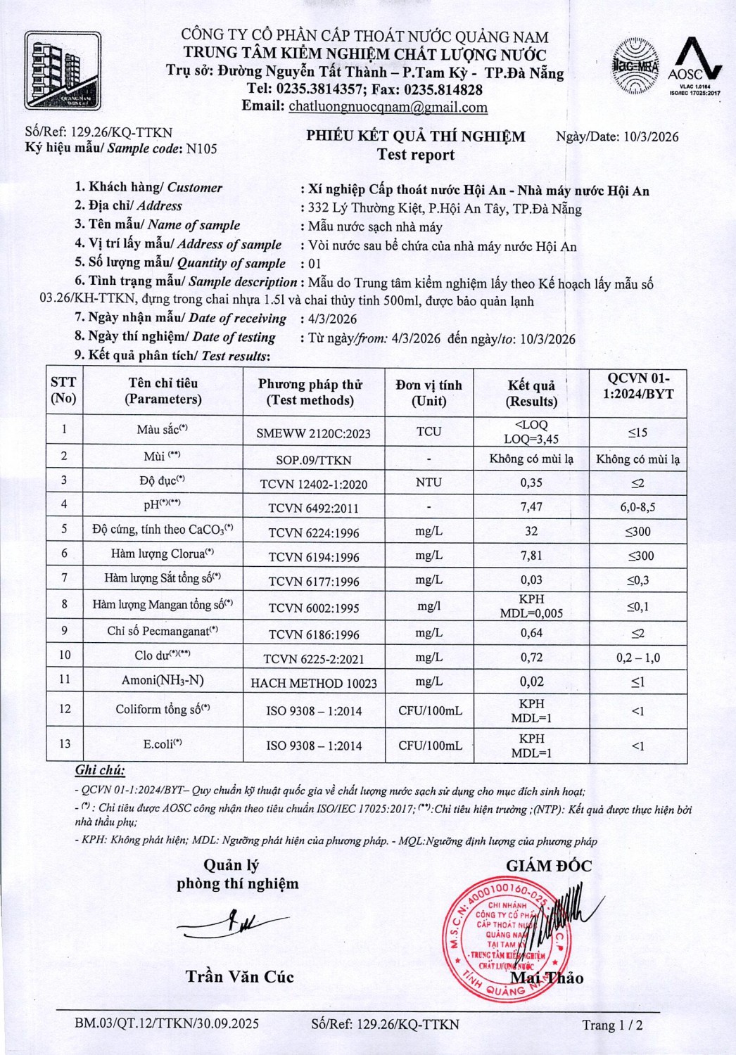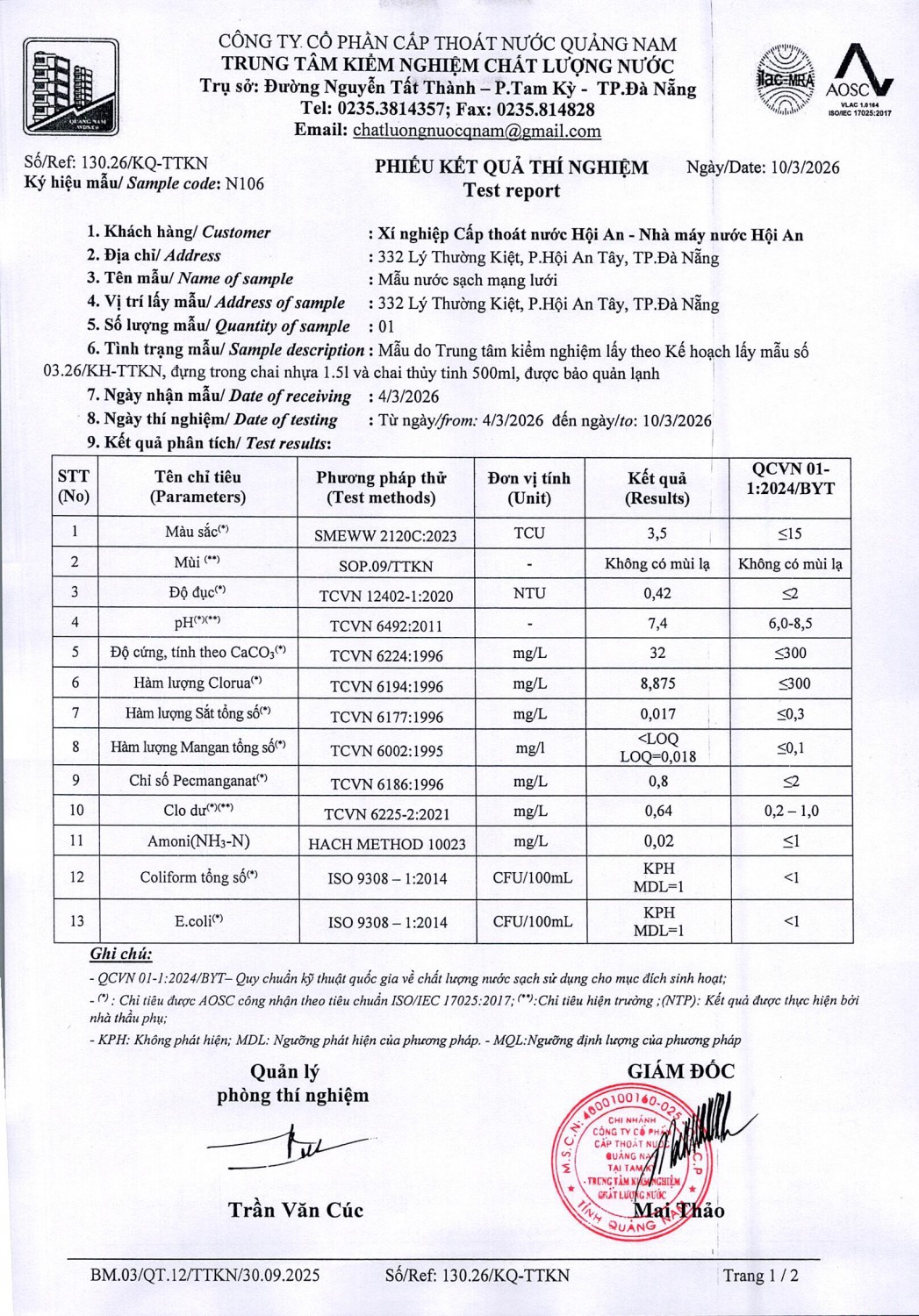 KẾT QUẢ CHẤT LƯỢNG NƯỚC XÍ NGHIỆP CTN HỘI AN - NMN HỘI AN THÁNG 3 NĂM 2026