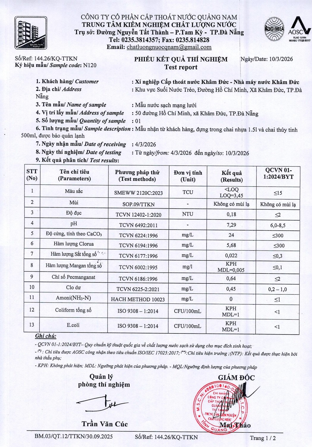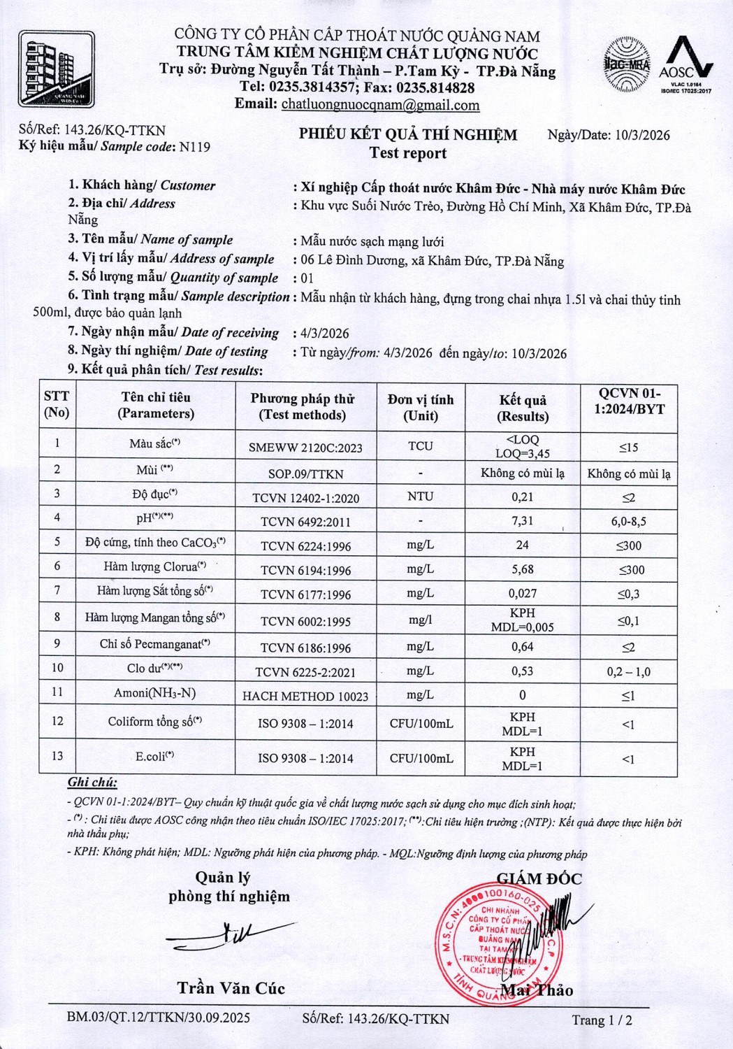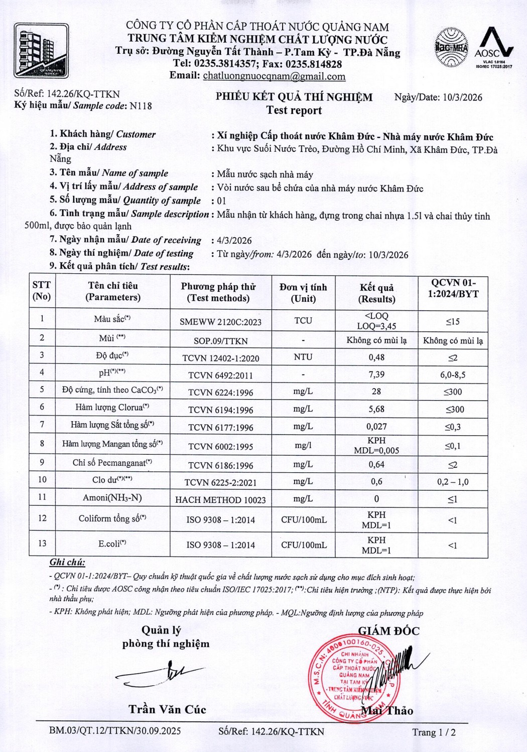 KẾT QUẢ CHẤT LƯỢNG NƯỚC XÍ NGHIỆP CTN KHÂM ĐỨC - NMN KHÂM ĐỨC ĐỢT 1 THÁNG 3 NĂM 2026