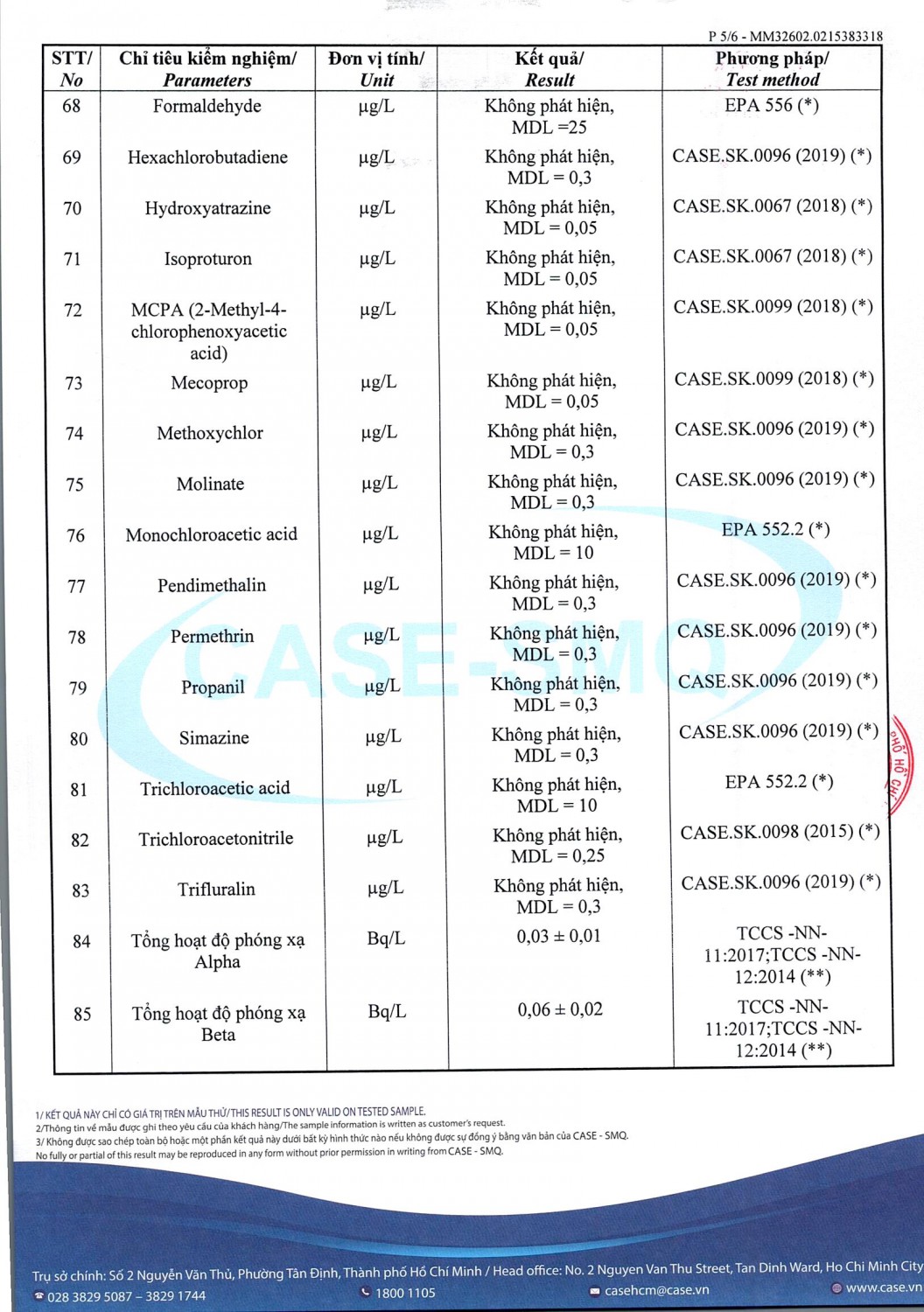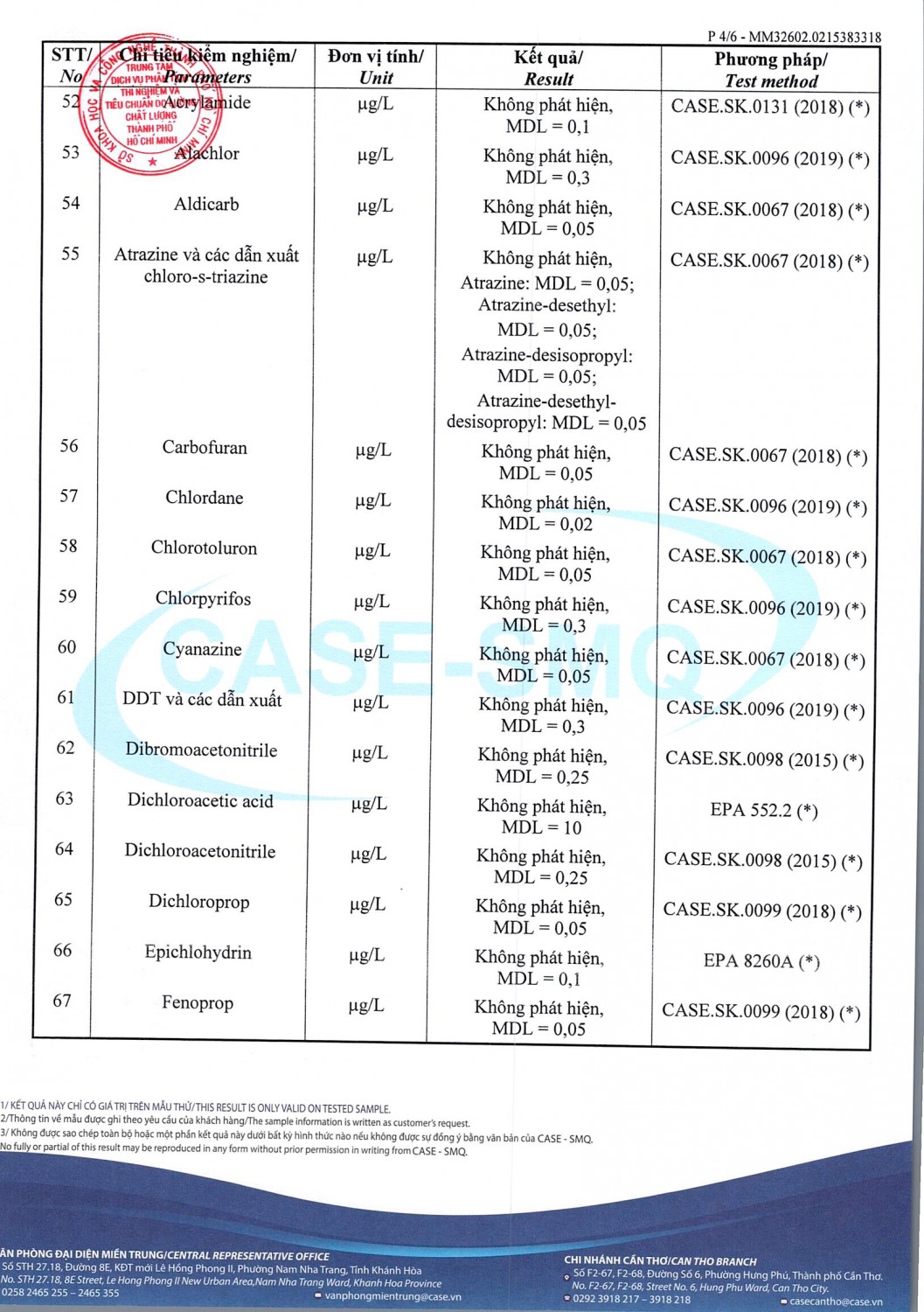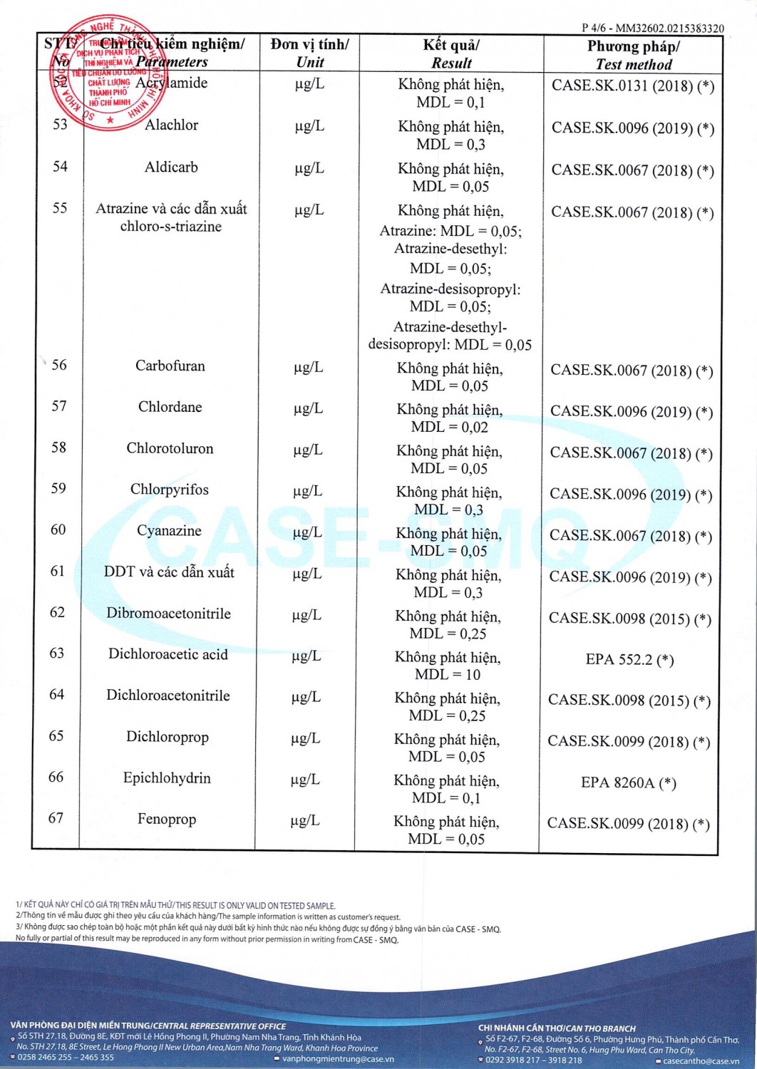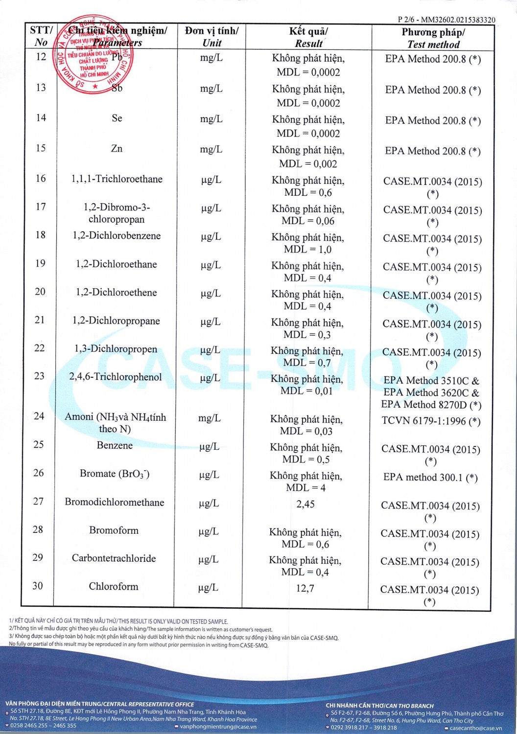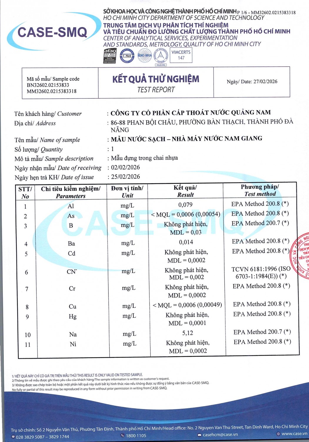 KẾT QUẢ CHẤT LƯỢNG NƯỚC CHỈ TIÊU B XÍ NGHIỆP CẤP THOÁT NƯỚC KHÂM ĐỨC - NHÀ MÁY NƯỚC NAM GIANG ĐỢT 1 NĂM 2026