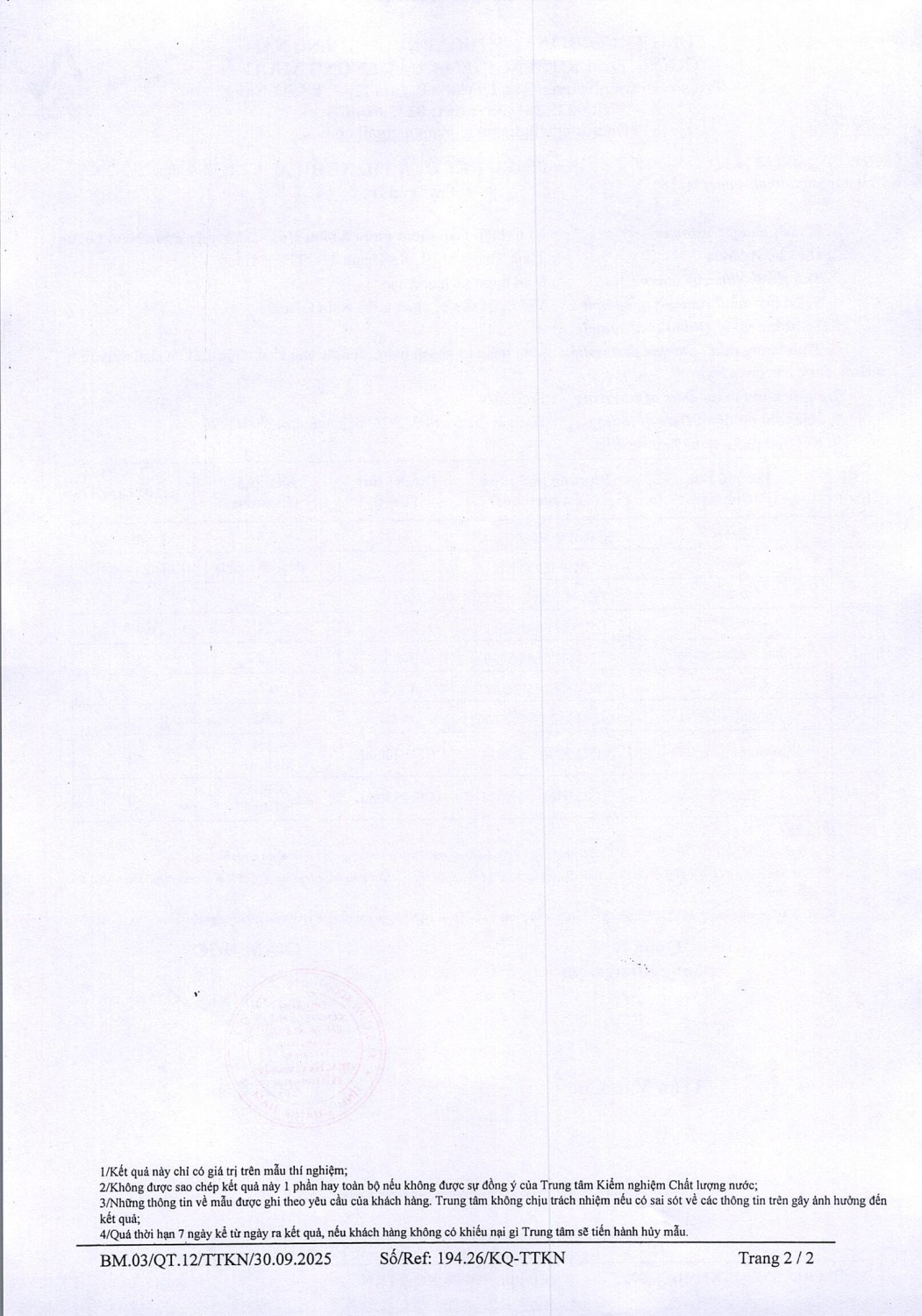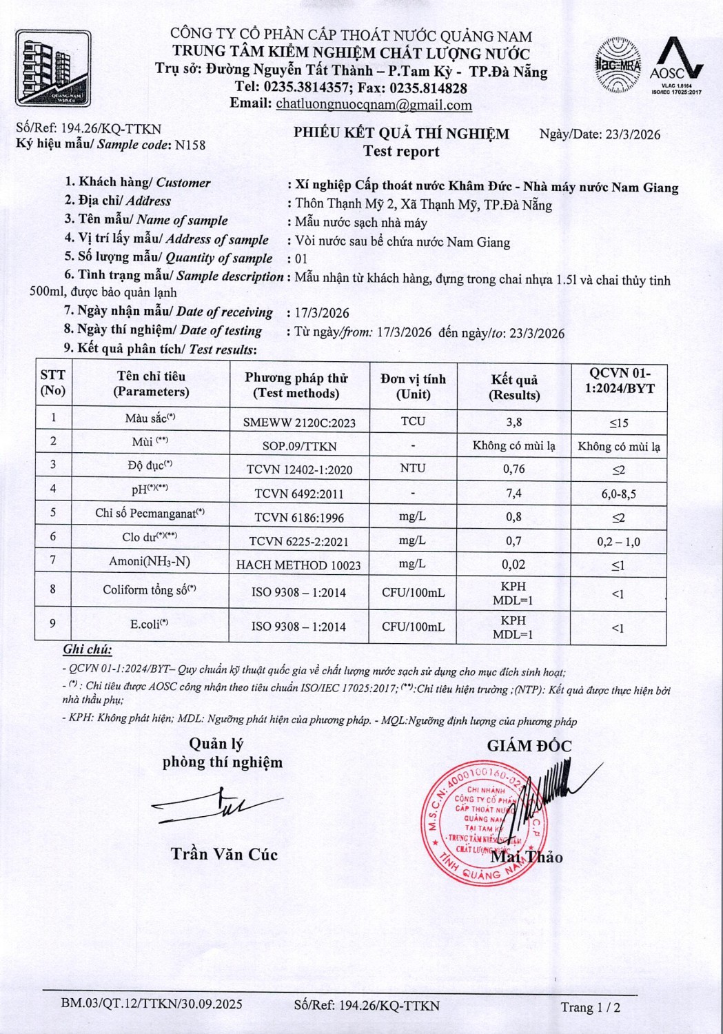 KẾT QUẢ CHẤT LƯỢNG NƯỚC XÍ NGHIỆP CTN KHÂM ĐỨC - NMN NAM GIANG ĐỢT 2 THÁNG 3 NĂM 2026