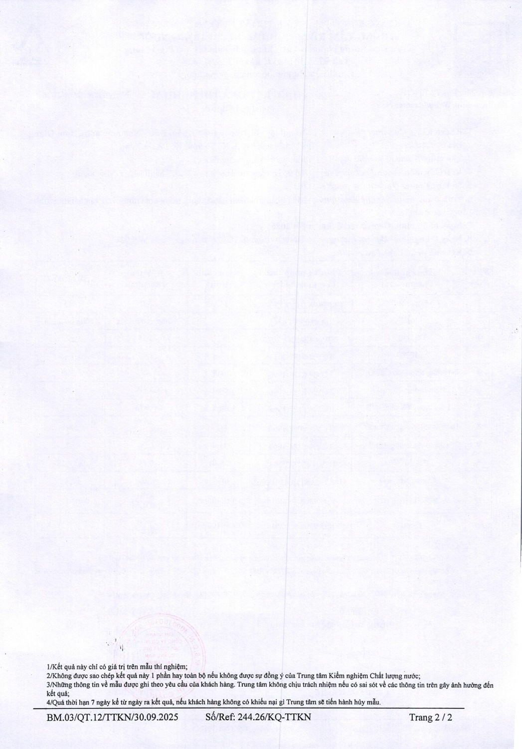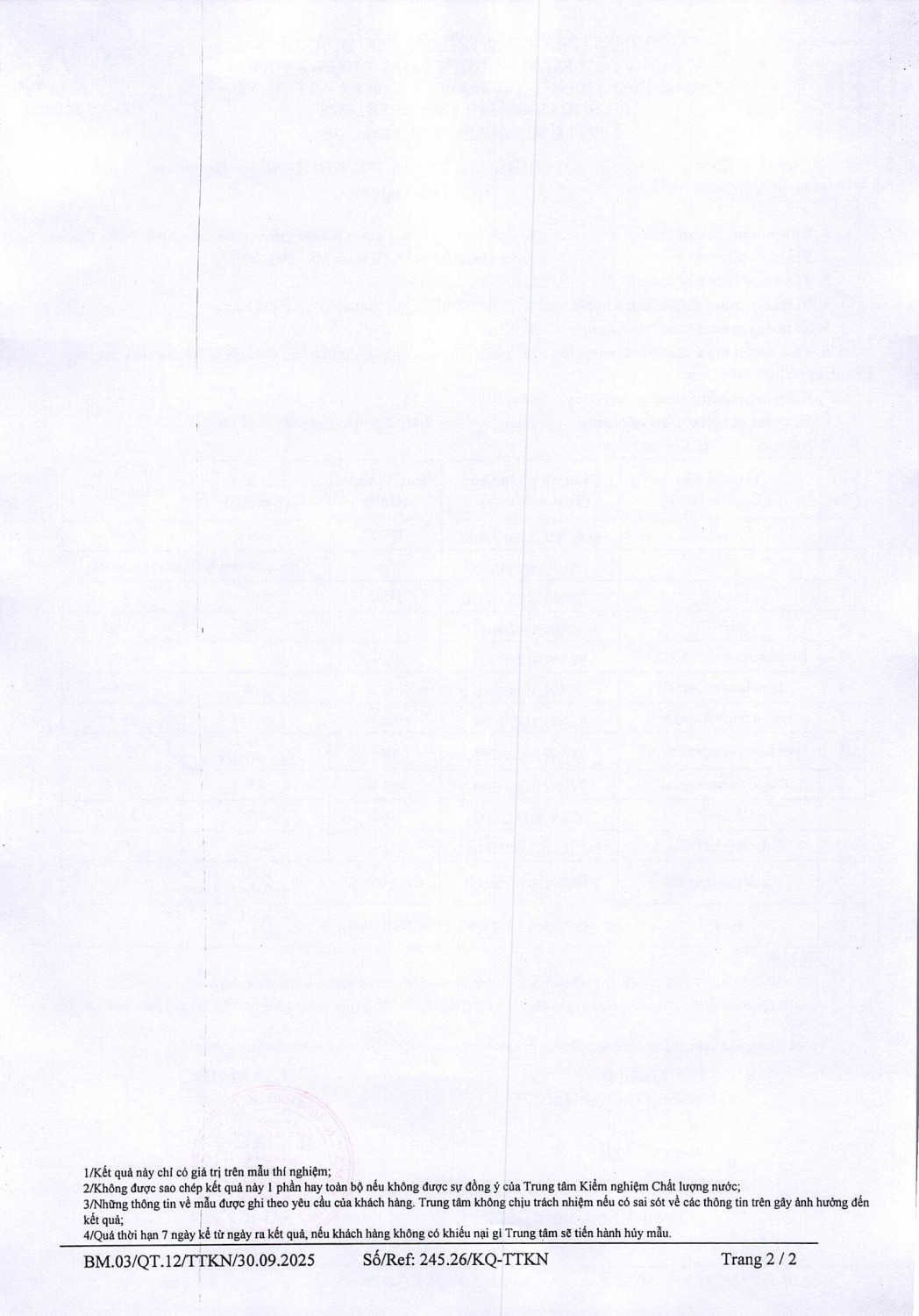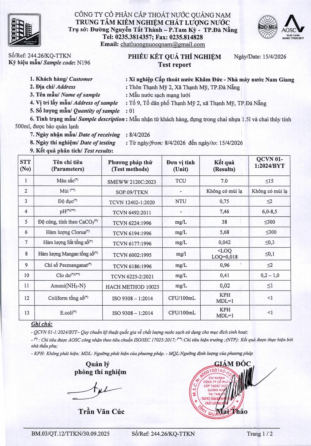 KẾT QUẢ CHẤT LƯỢNG NƯỚC XÍ NGHIỆP CTN KHÂM ĐỨC - NMN NAM GIANG THÁNG 4 NĂM 2026