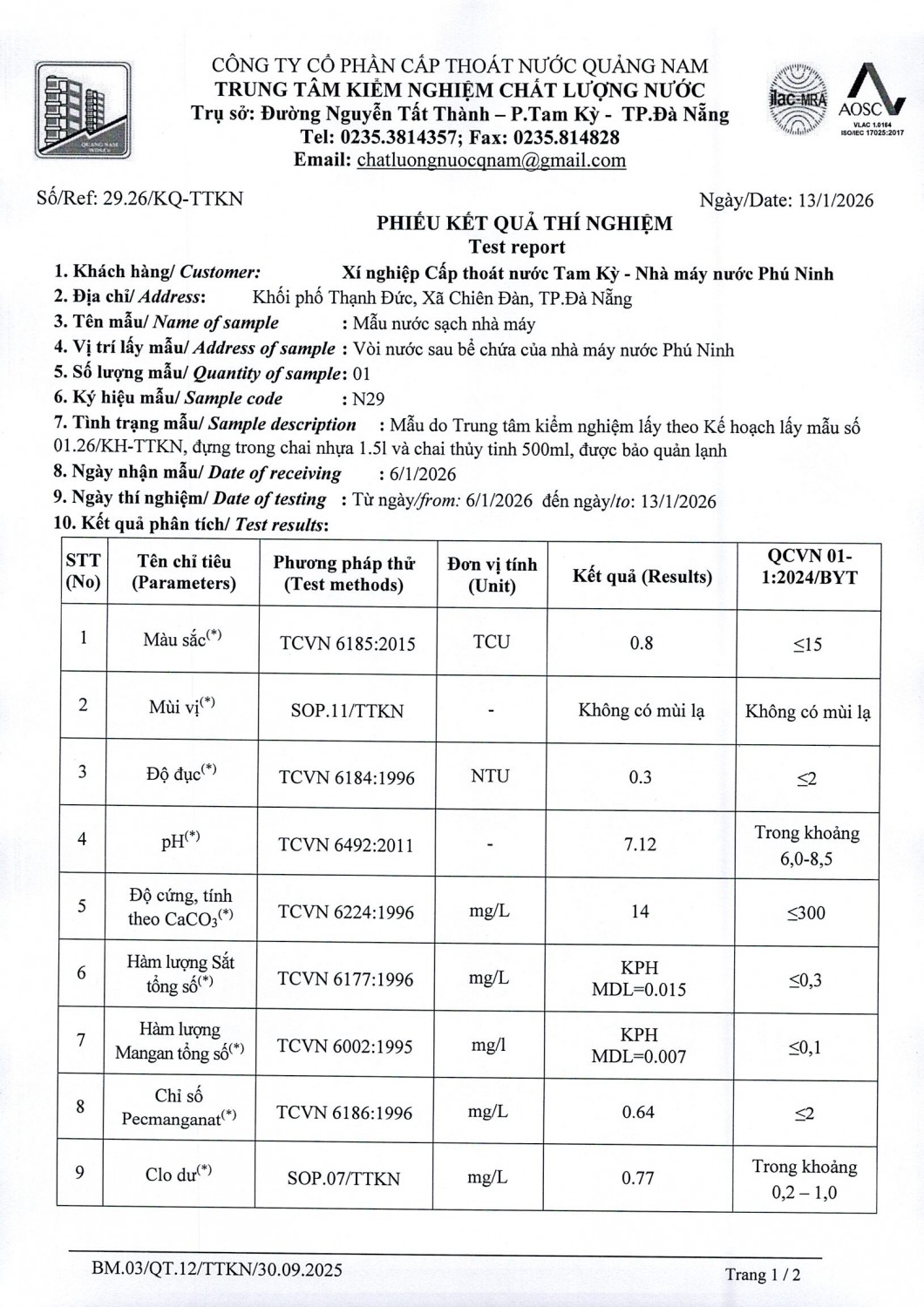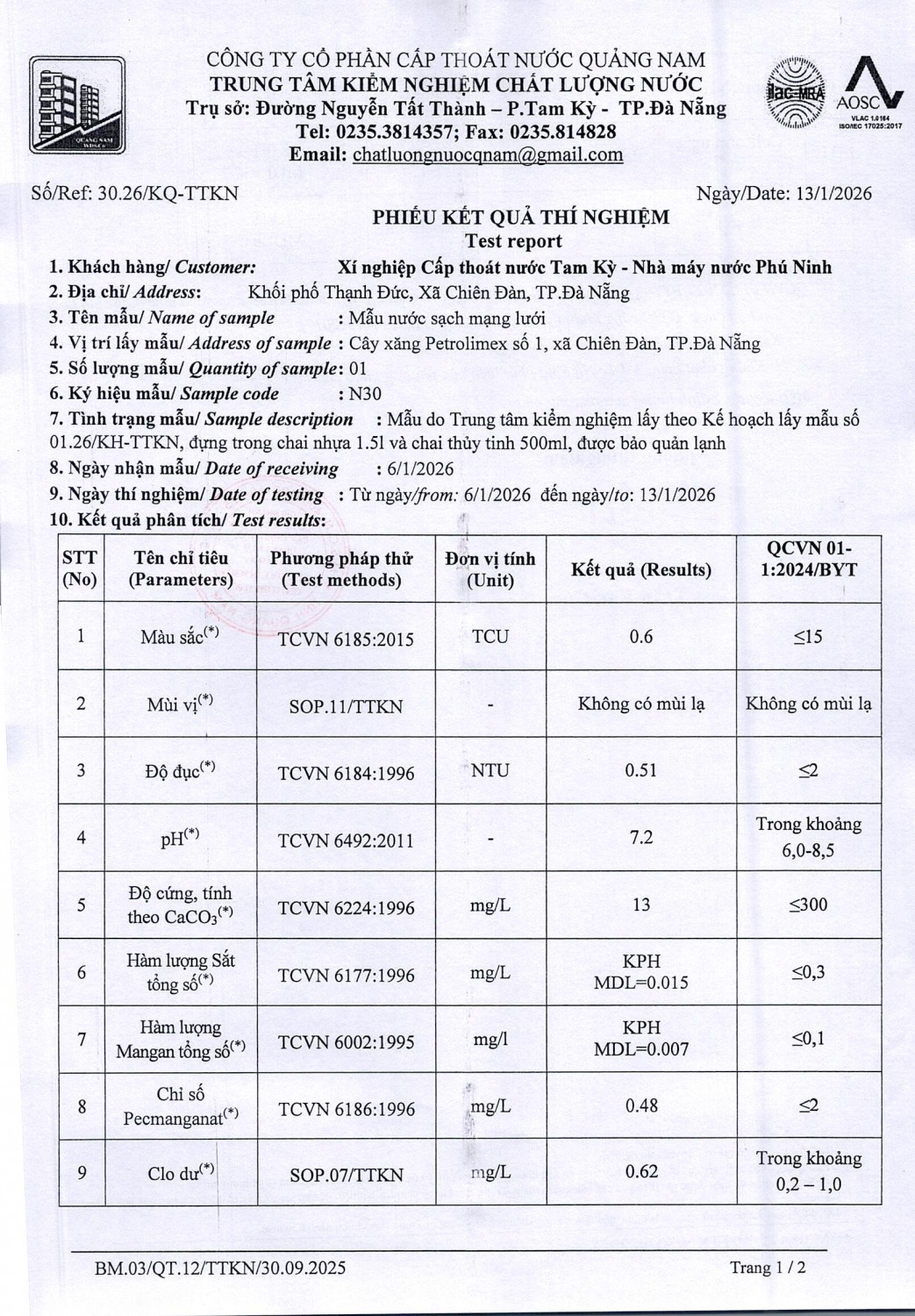 KẾT QUẢ CHẤT LƯỢNG NƯỚC XÍ NGHIỆP CTN TAM KỲ - NMN PHÚ NINH THÁNG 1 NĂM 2026
