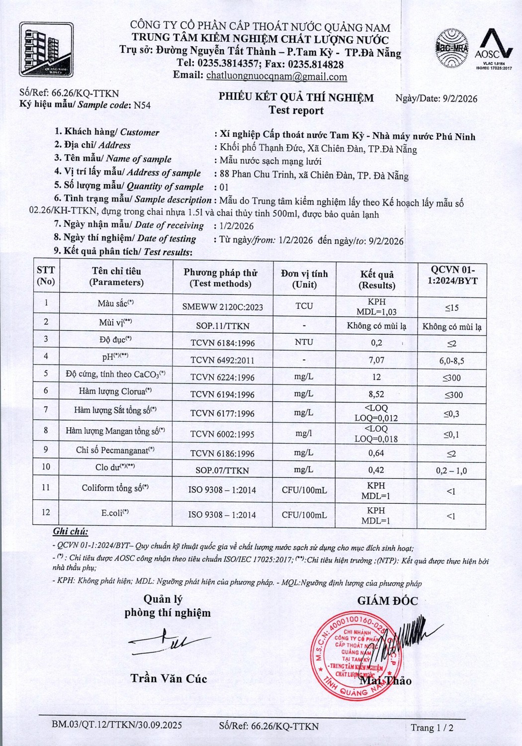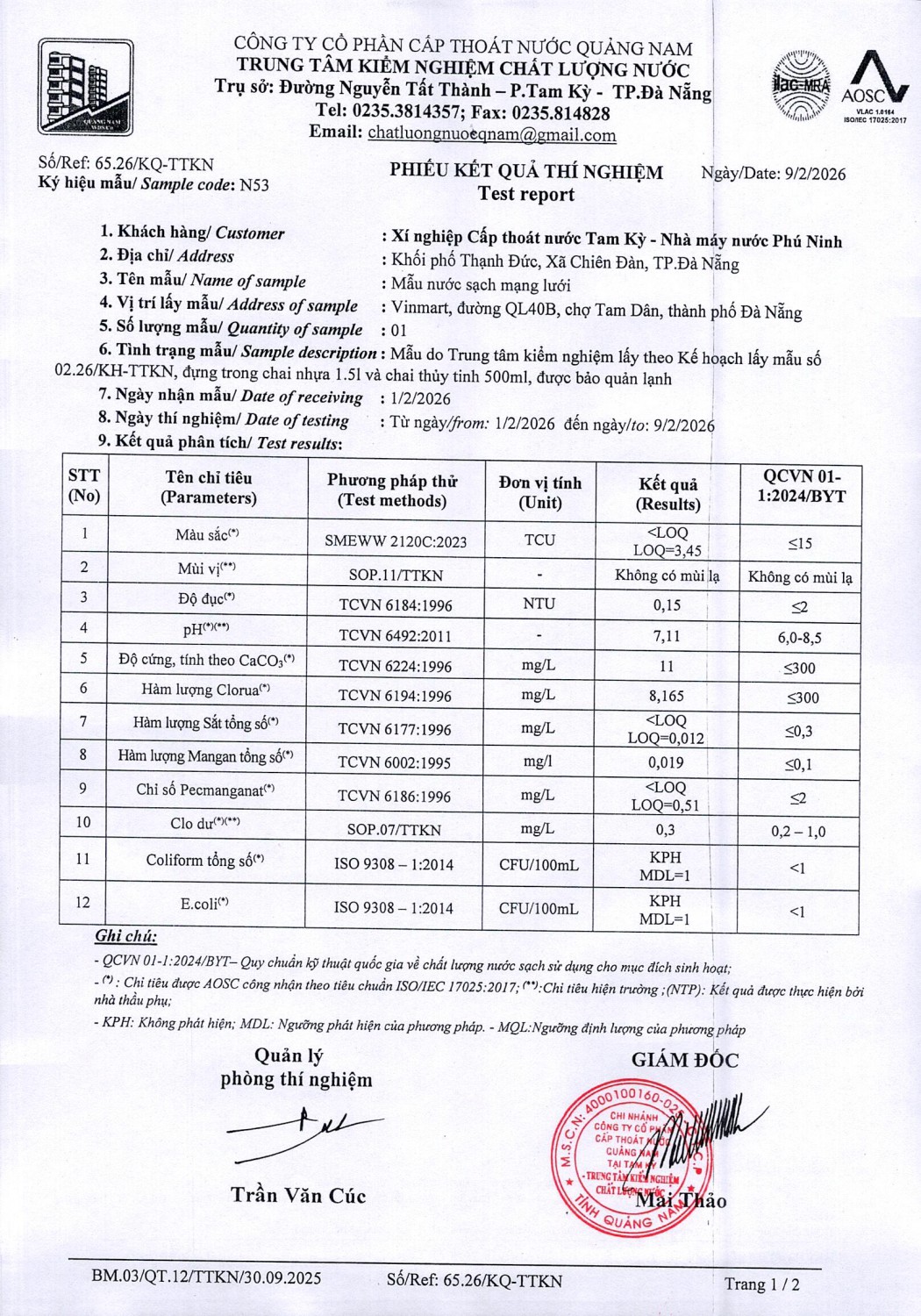 KẾT QUẢ CHẤT LƯỢNG NƯỚC XÍ NGHIỆP CTN TAM KỲ - NMN PHÚ NINH THÁNG 2 NĂM 2026