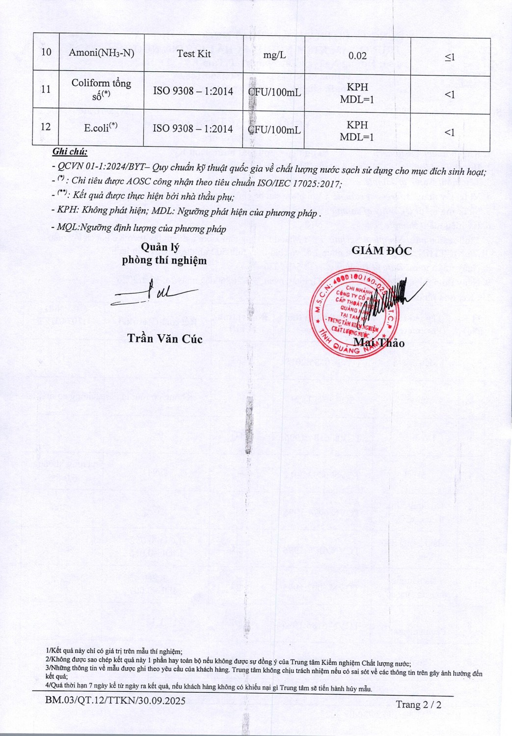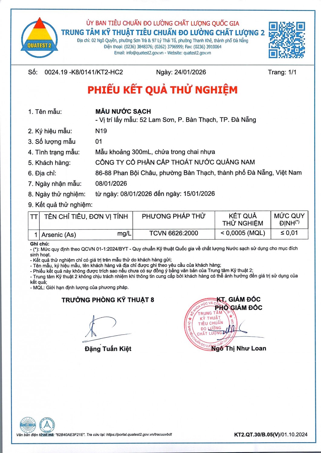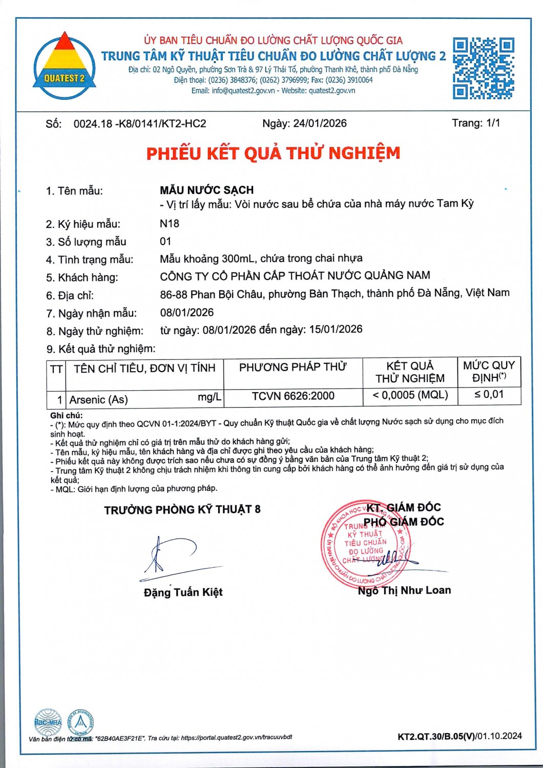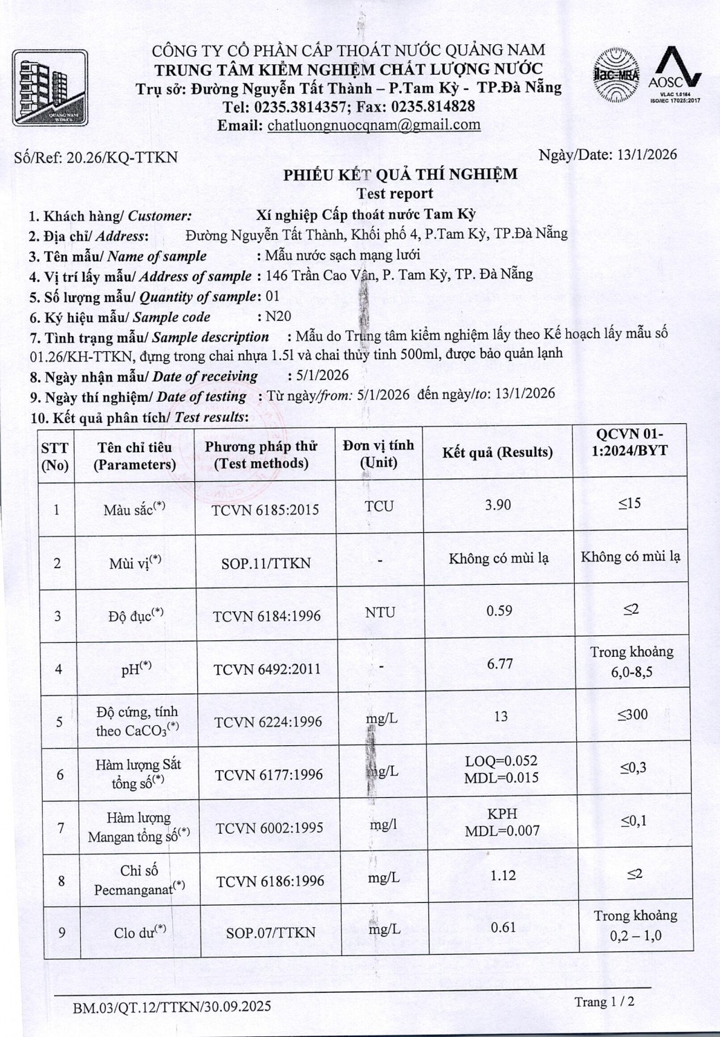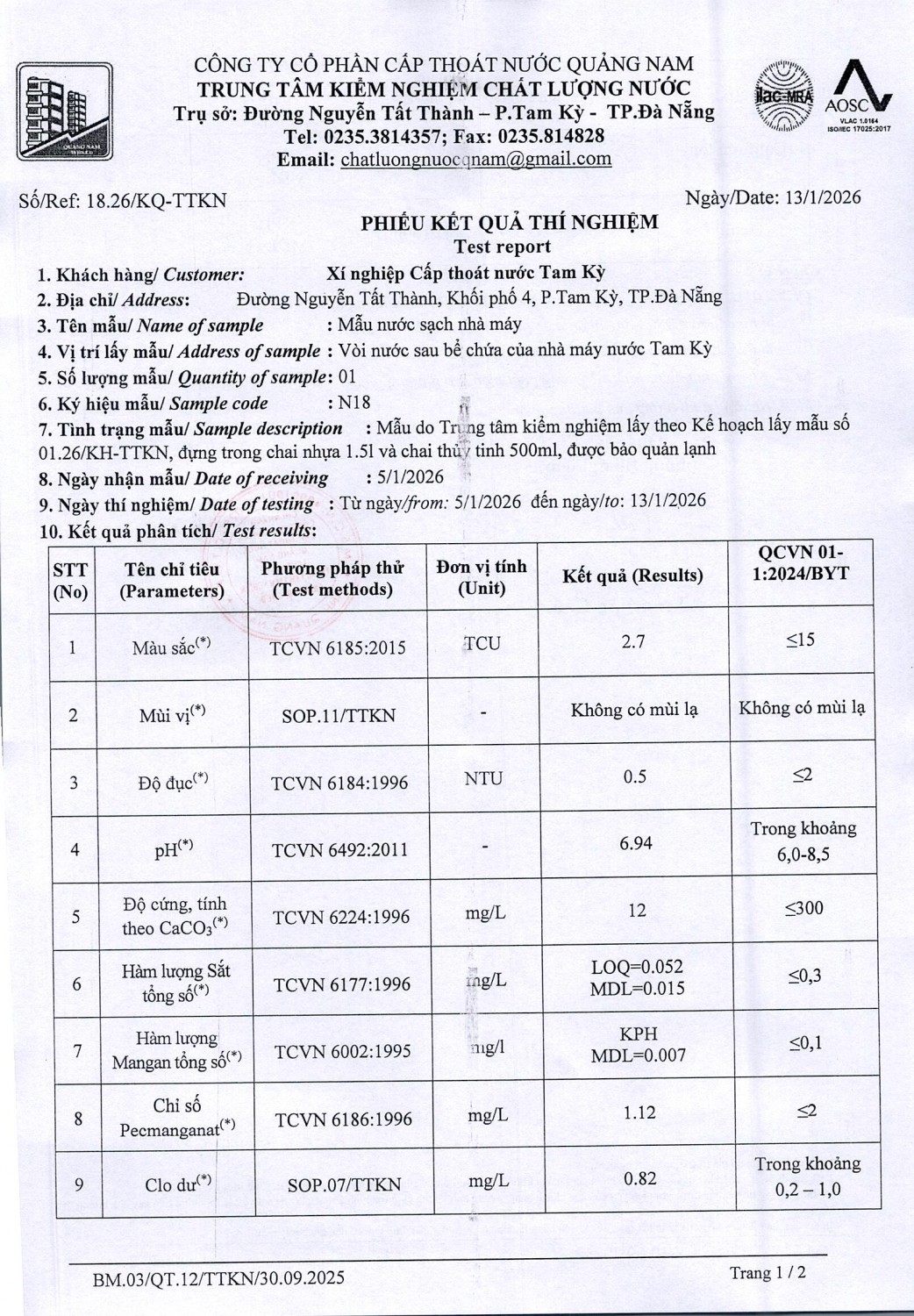 KẾT QUẢ CHẤT LƯỢNG NƯỚC XÍ NGHIỆP CTN TAM KỲ - NMN TAM KỲ THÁNG 1 NĂM 2026