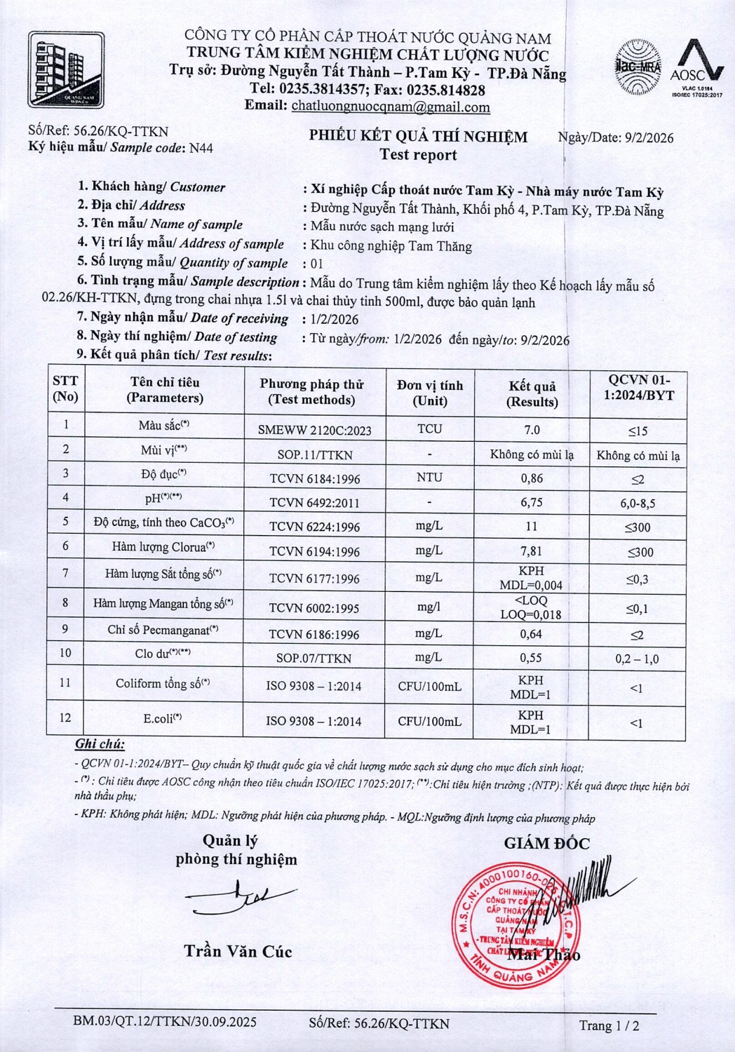 KẾT QUẢ CHẤT LƯỢNG NƯỚC XÍ NGHIỆP CTN TAM KỲ - NMN TAM KỲ THÁNG 2 NĂM 2026
