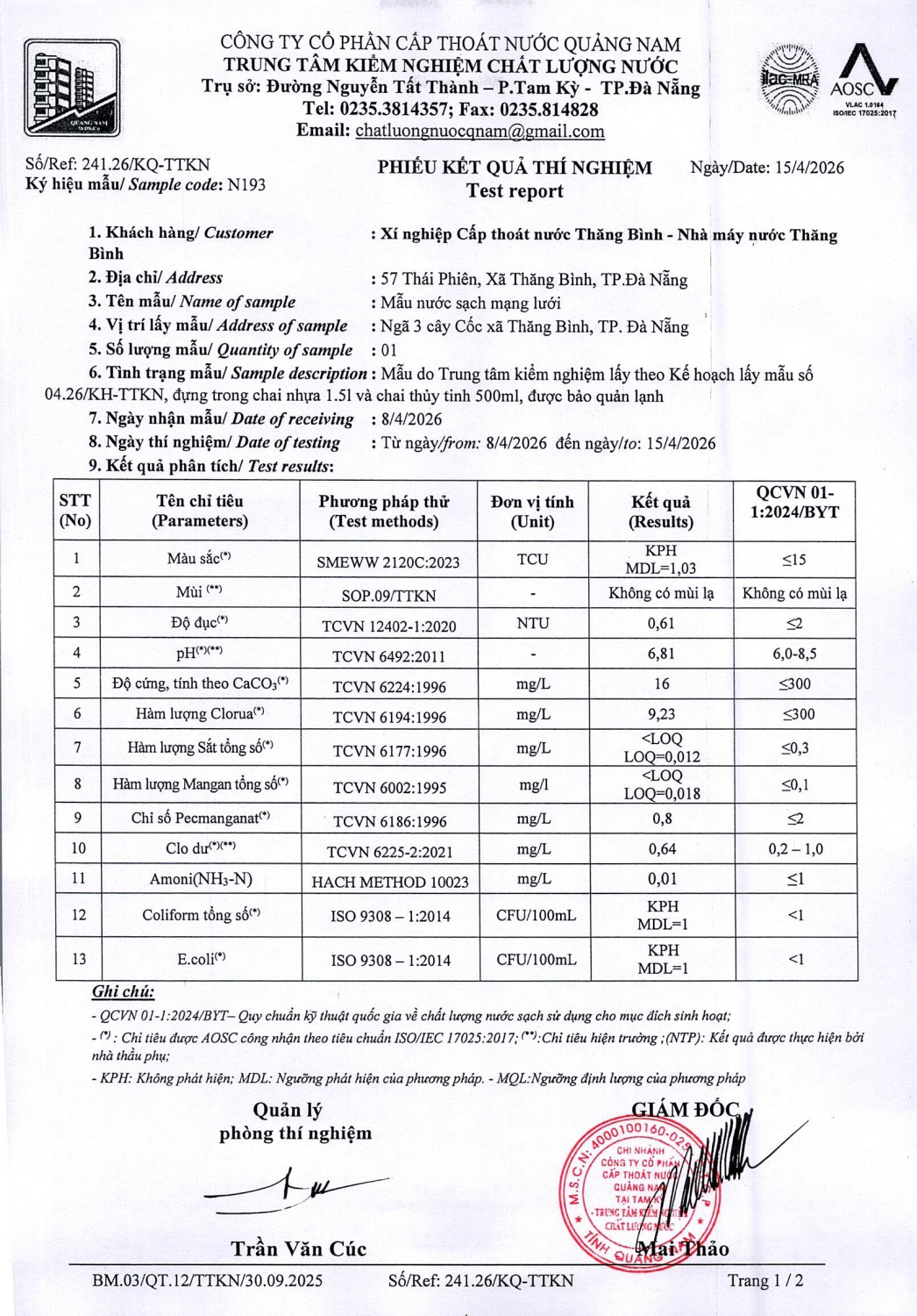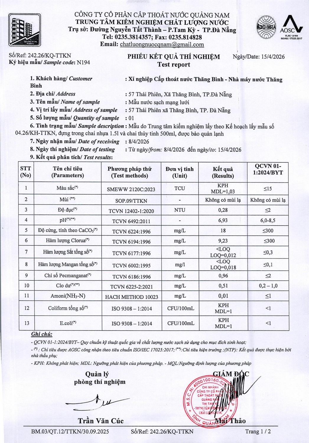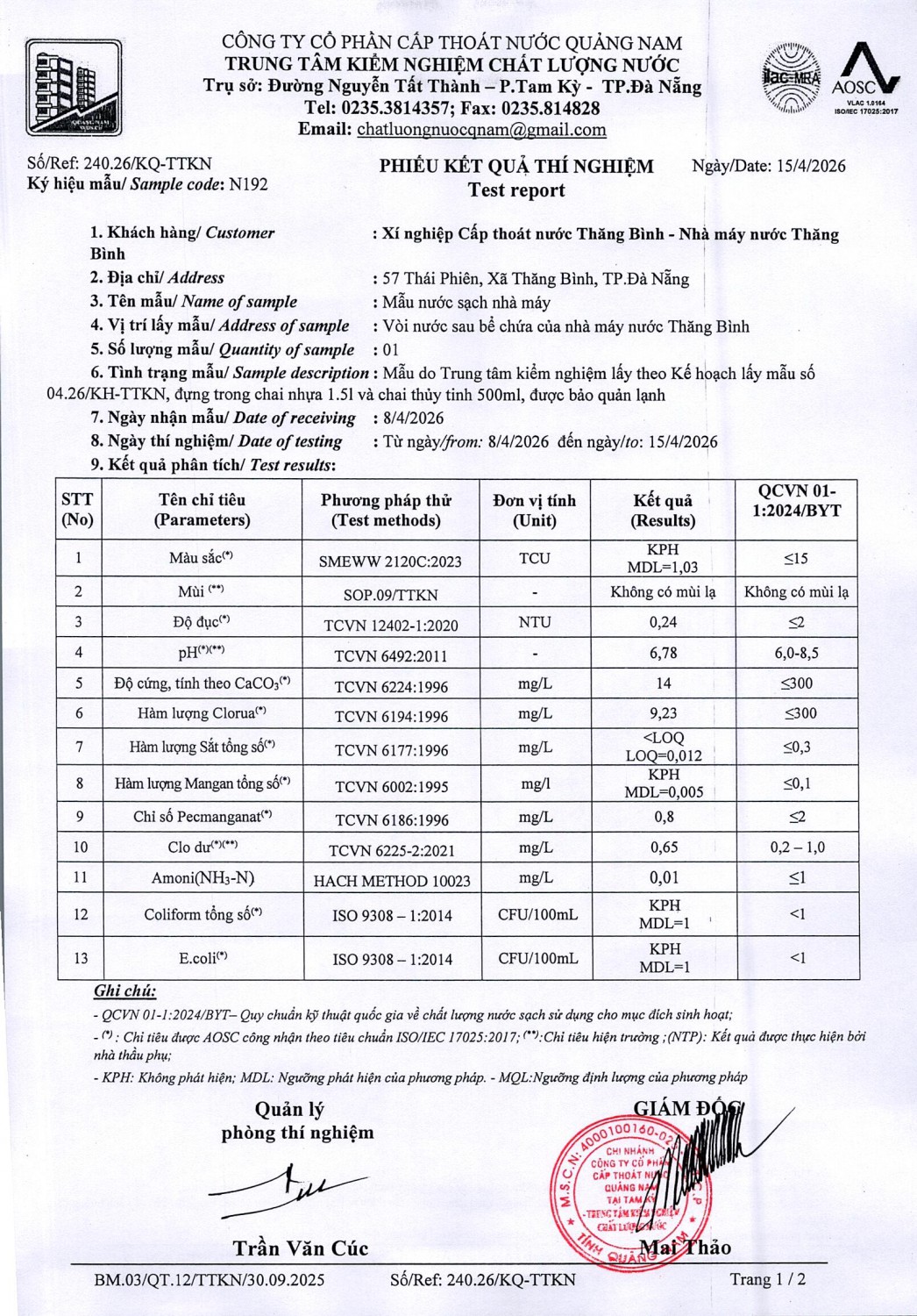 KẾT QUẢ CHẤT LƯỢNG NƯỚC XÍ NGHIỆP CTN THĂNG BÌNH - NMN THĂNG BÌNH THÁNG 4 NĂM 2026