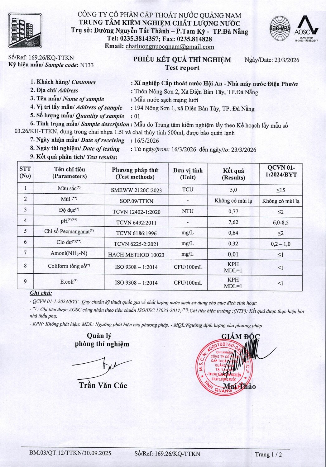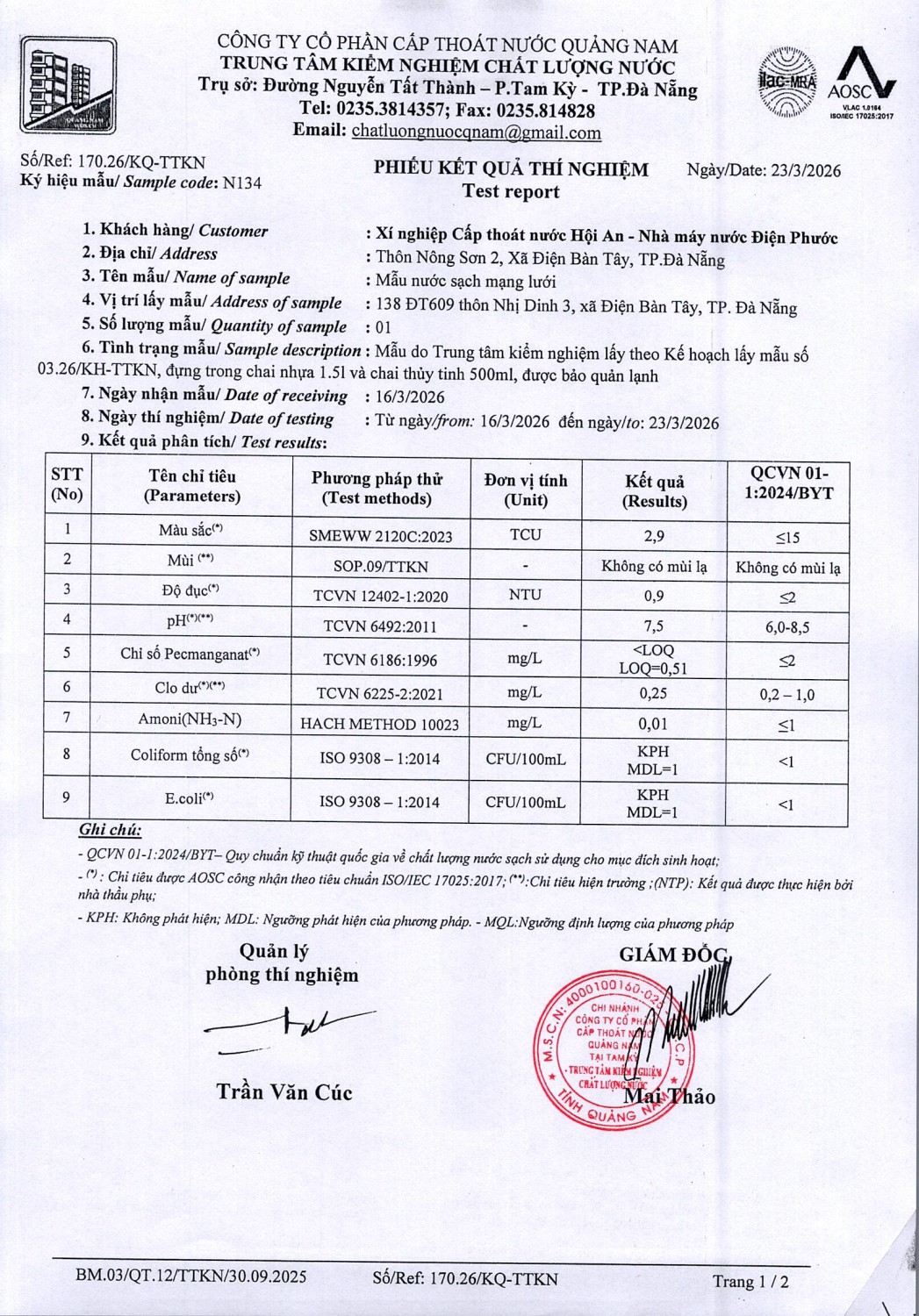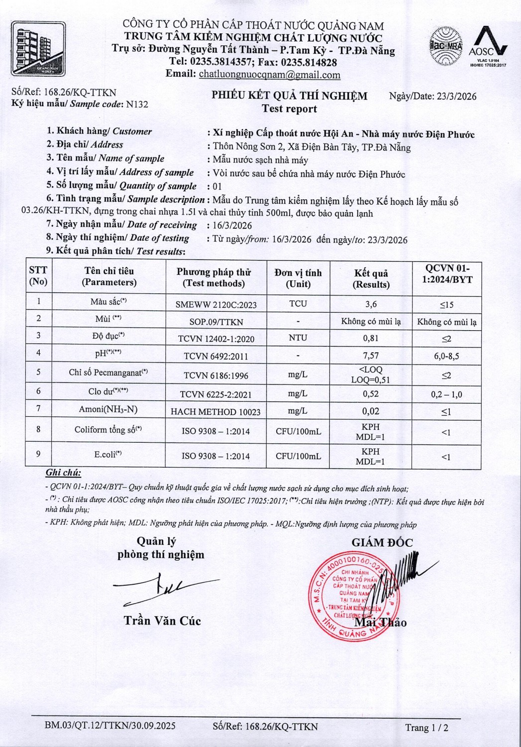 <title>KẾT QUẢ CHẤT LƯỢNG NƯỚC XÍ NGHIỆP CTN HỘI AN - NMN ĐIỆN PHƯỚC ĐỢT 2 THÁNG 3 NĂM 2026</title>