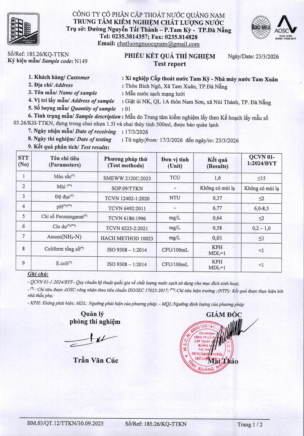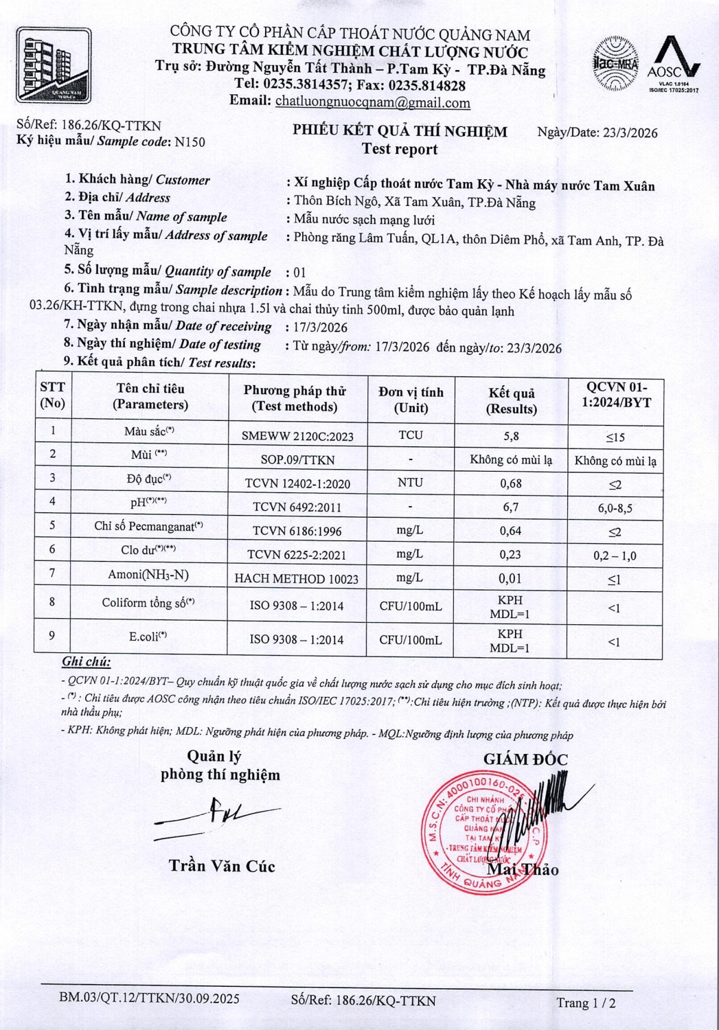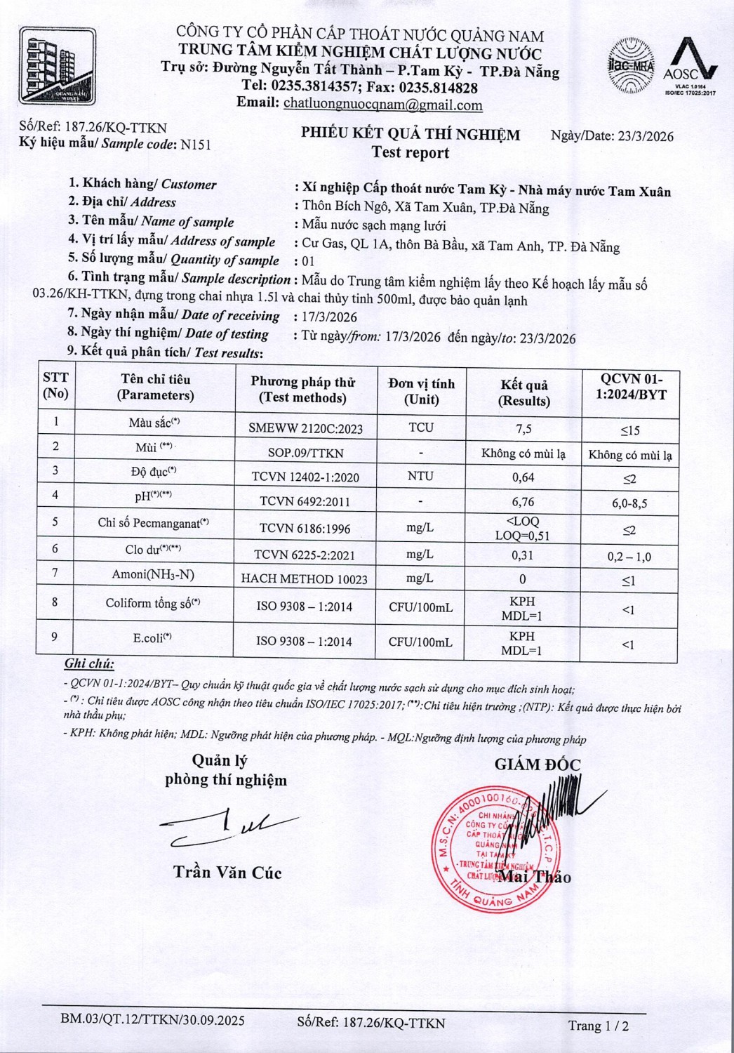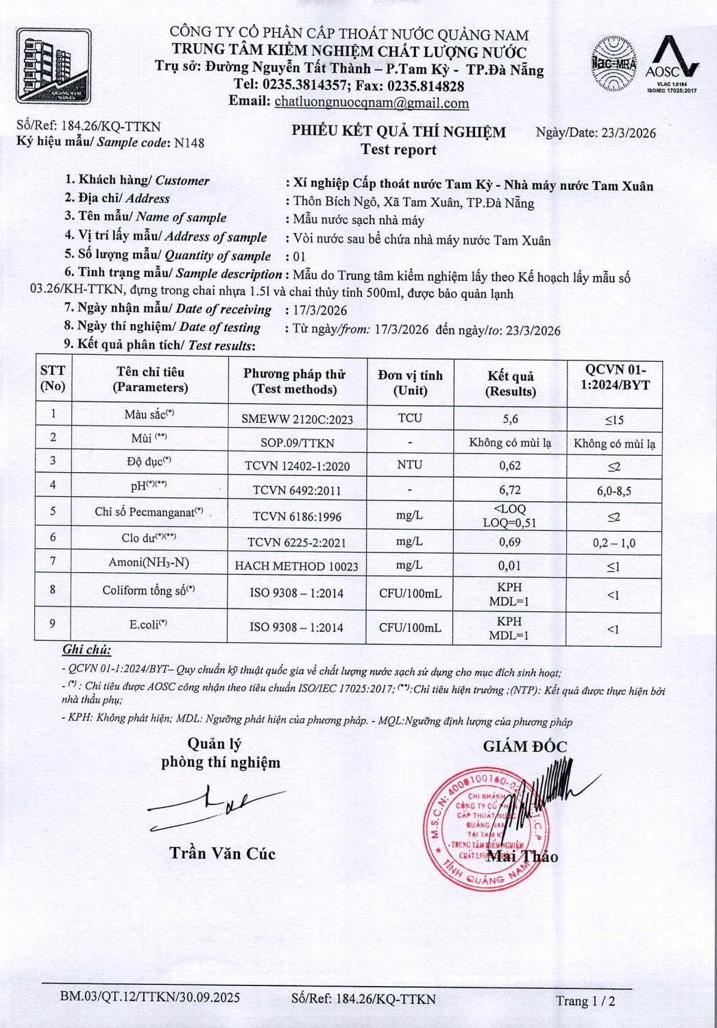 <h1>KẾT QUẢ CHẤT LƯỢNG NƯỚC XÍ NGHIỆP CTN TAM KỲ - NMN TAM XUÂN ĐỢT 2 THÁNG 3 NĂM 2026</h1>