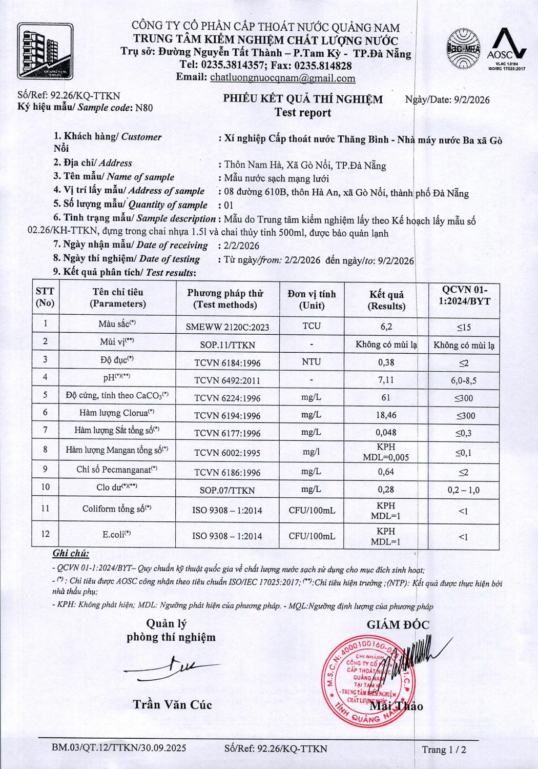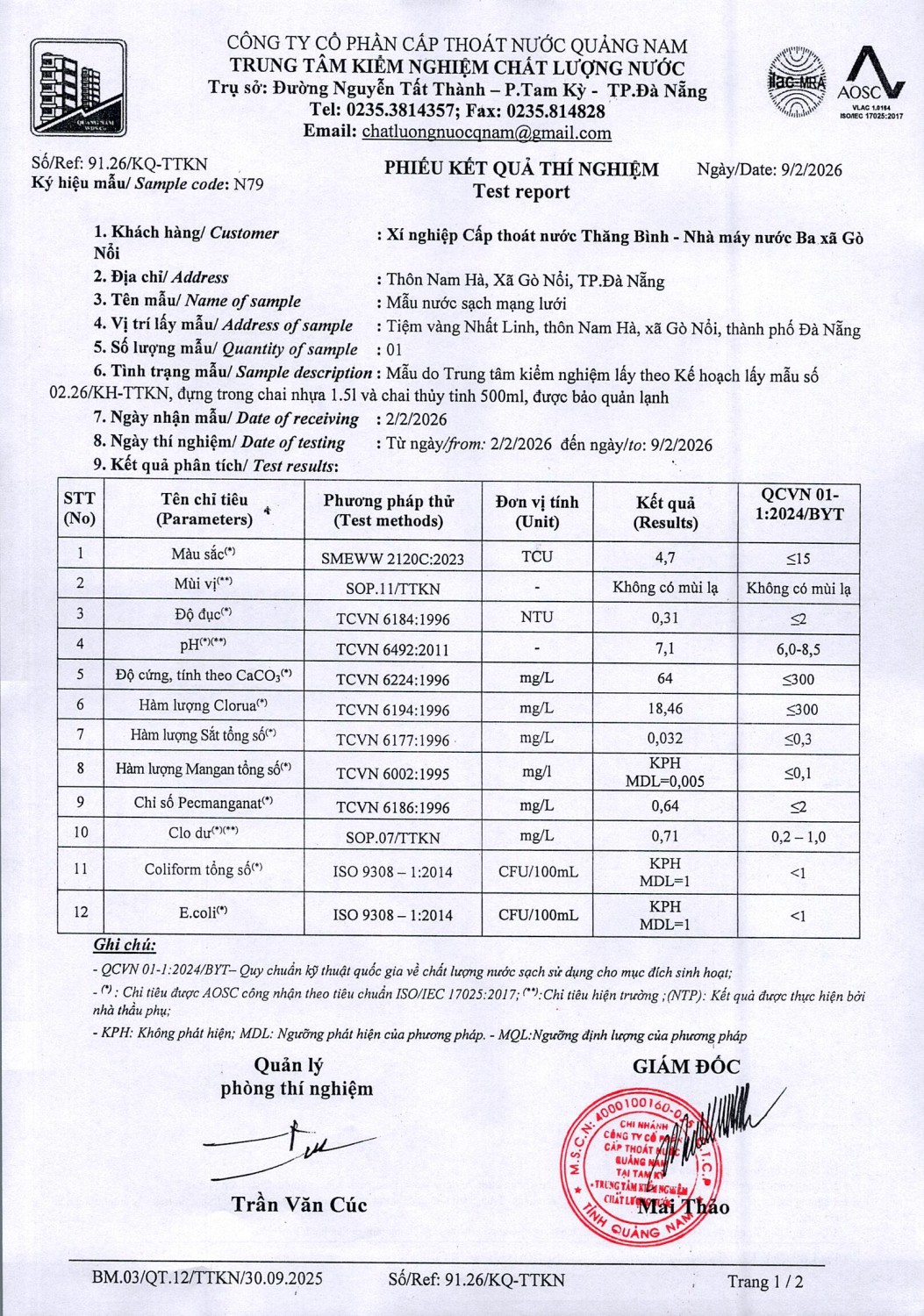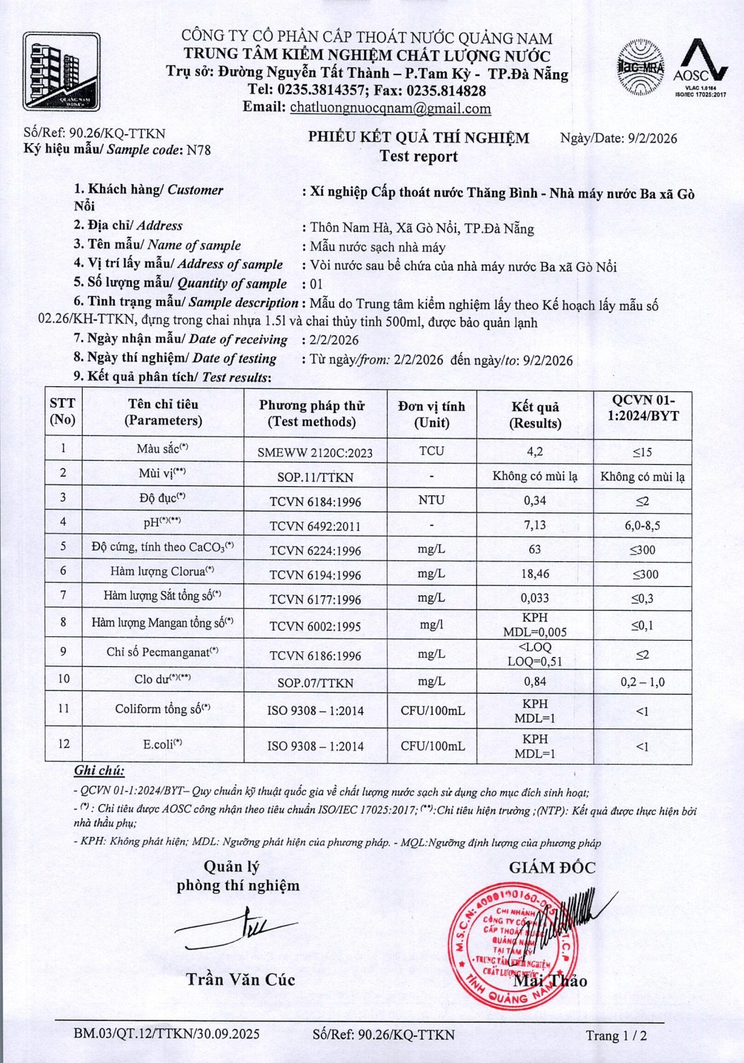 KẾT QUẢ CHẤT LƯỢNG NƯỚC XN CTN THĂNG BÌNH - NMN 3 XÃ GÒ NỔI THÁNG 2 NĂM 2026