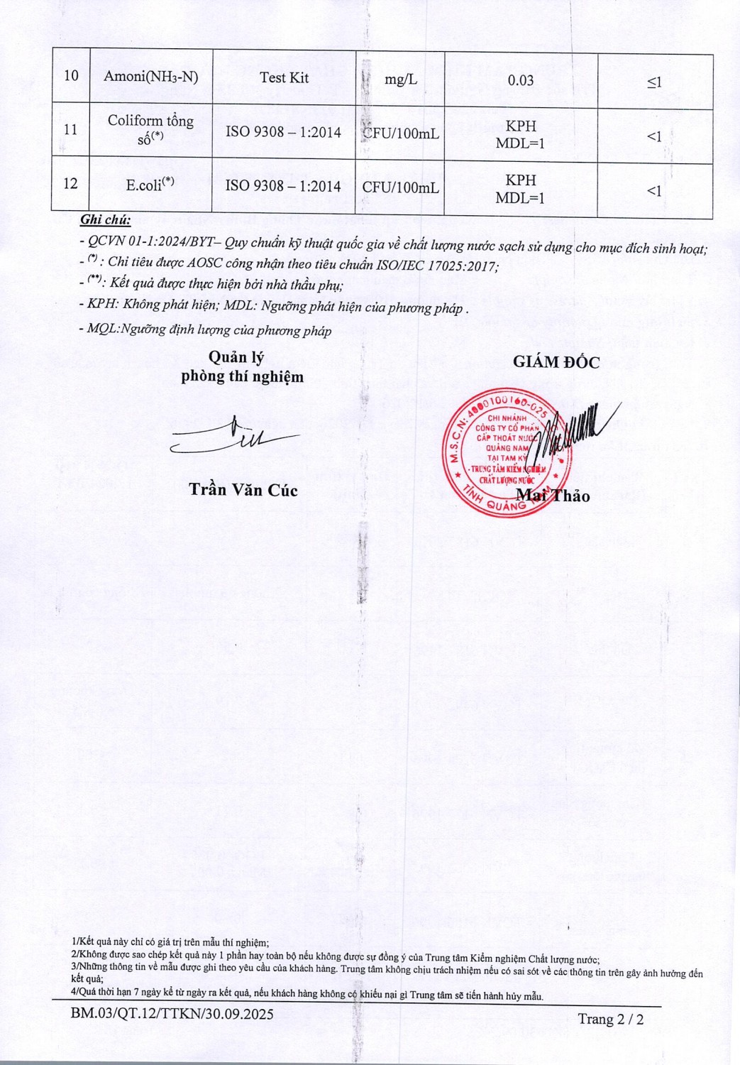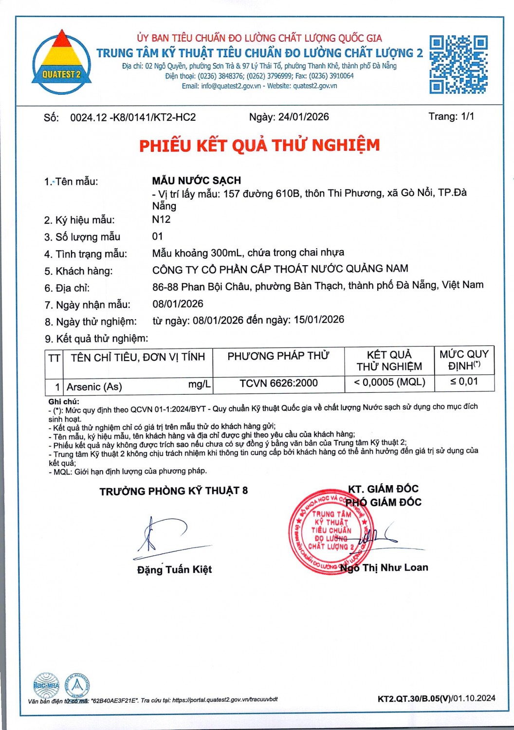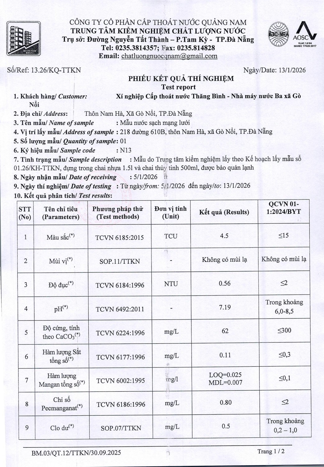 KẾT QUẢ CHẤT LƯỢNG NƯỚC XN CTN THĂNG BÌNH - NMN GÒ NỔI THÁNG 1 NĂM 2026